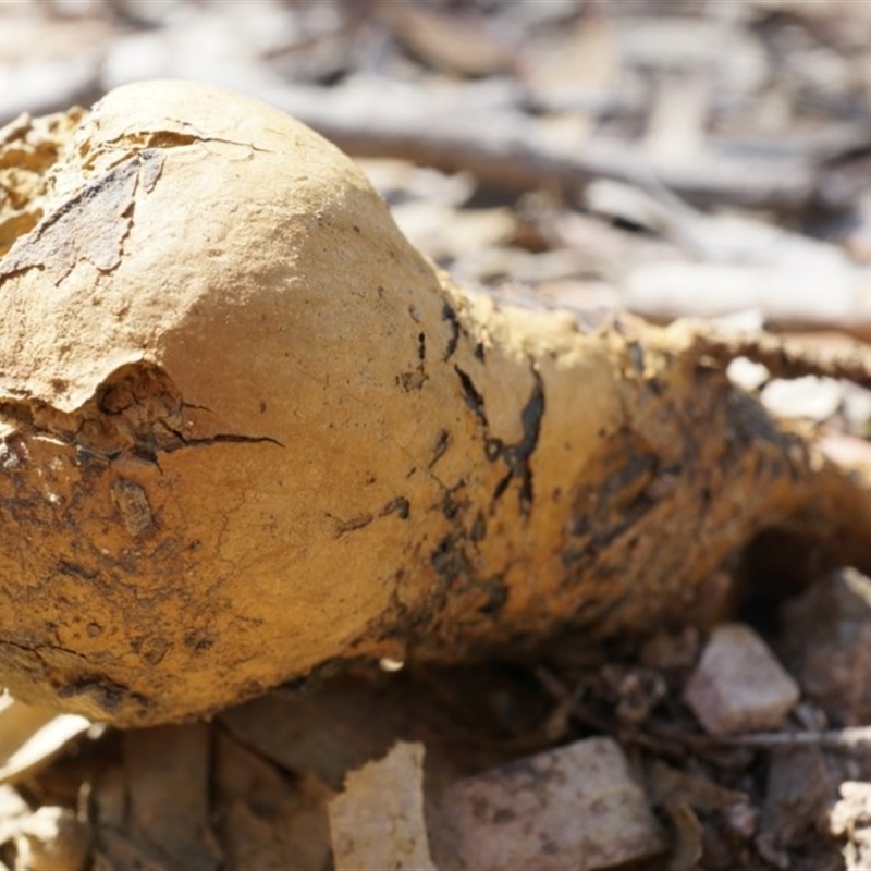 Arachnion: The fruitbodies range from 5 to 20 millimetres in diameter, have a thin, fragile skin with the interior looking as though it is filled with peridioles the size of sand grains. The fruitbody is white to yellowish or khaki shades. It has been found once in the local area, on the eastern slopes of Black Mountain. The peridioles in that collection are about a quarter of a millimetre in diameter.