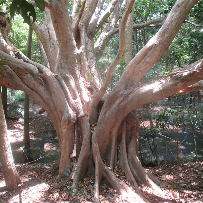 Leaf base showing domatia in the axils between the midrib and the secondary veins .