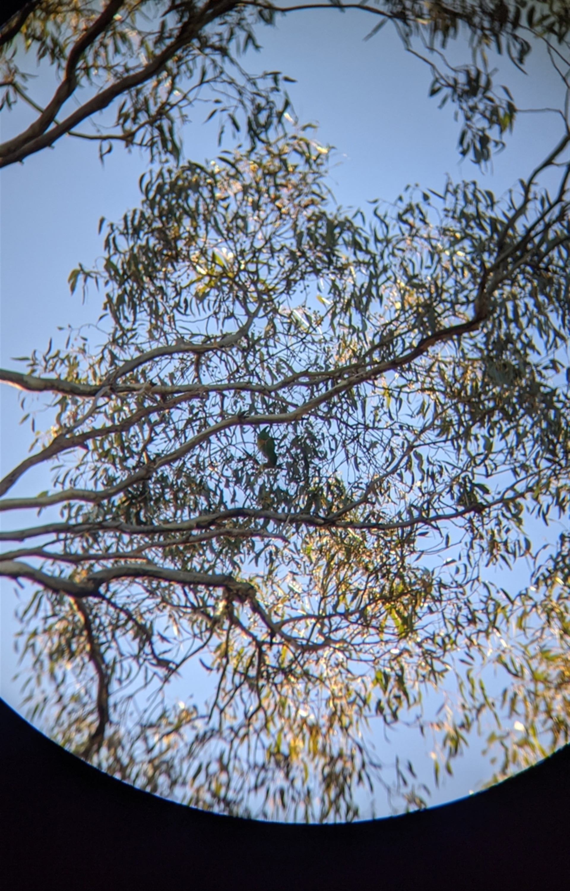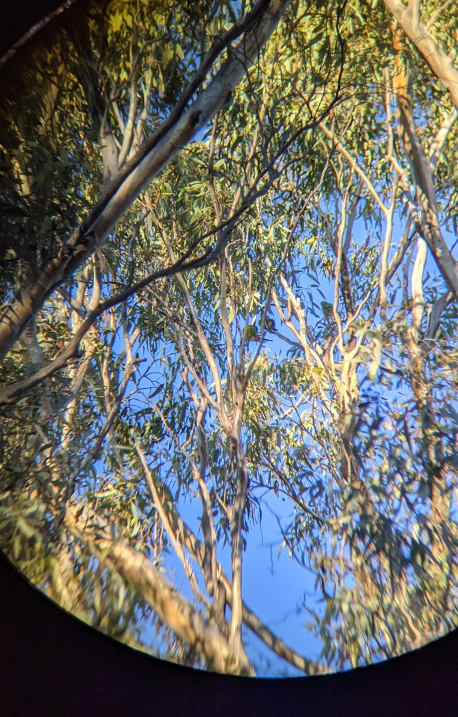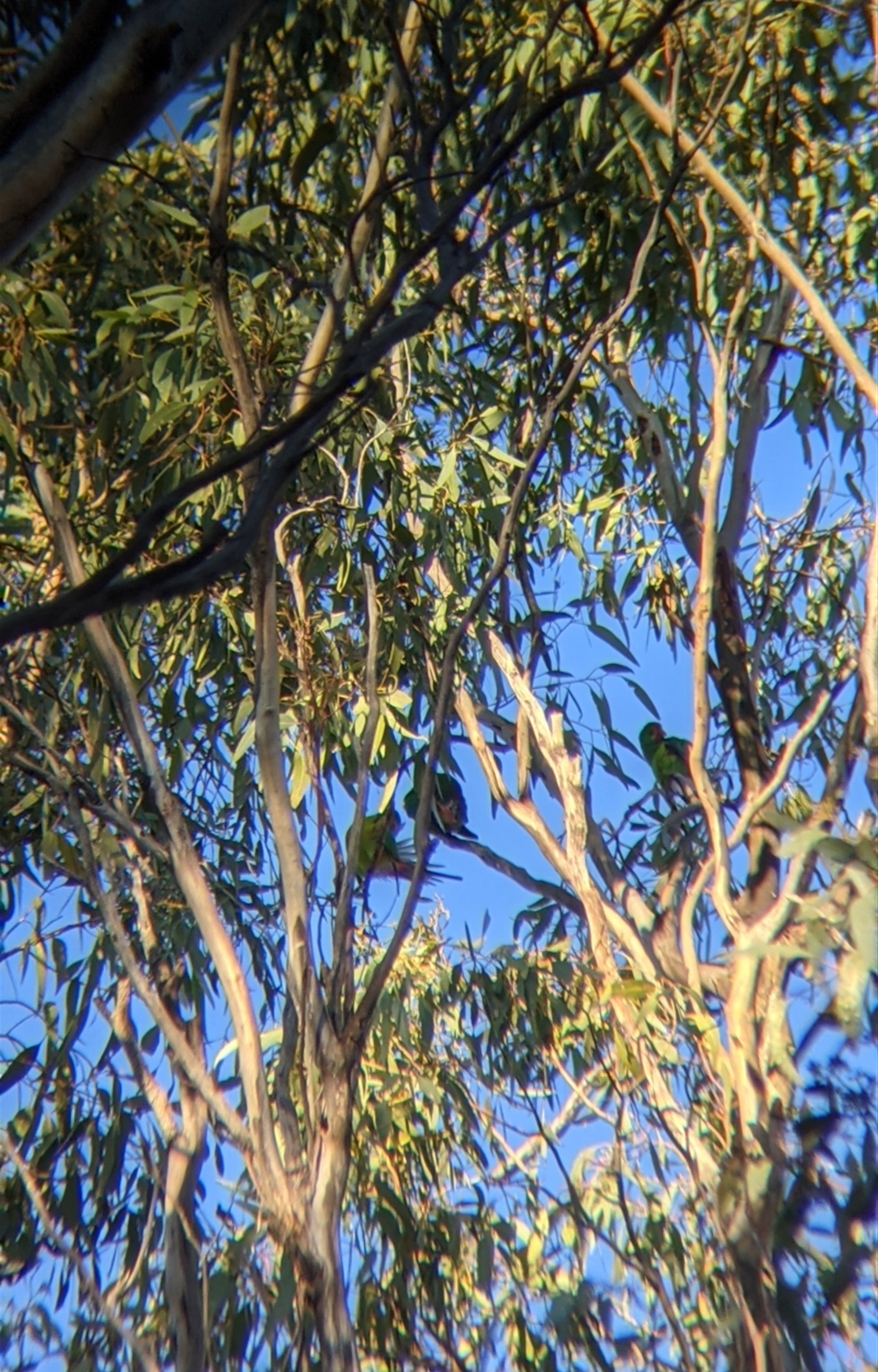 Small group of Swift parrots, gleaning in a yellow box and also preening. Hard to get a good picture with just a phone and pair of binocs, as they were high up in the top of the tree, but you can definitely see the distinctive red face patch on the bird on the right in the first picture.