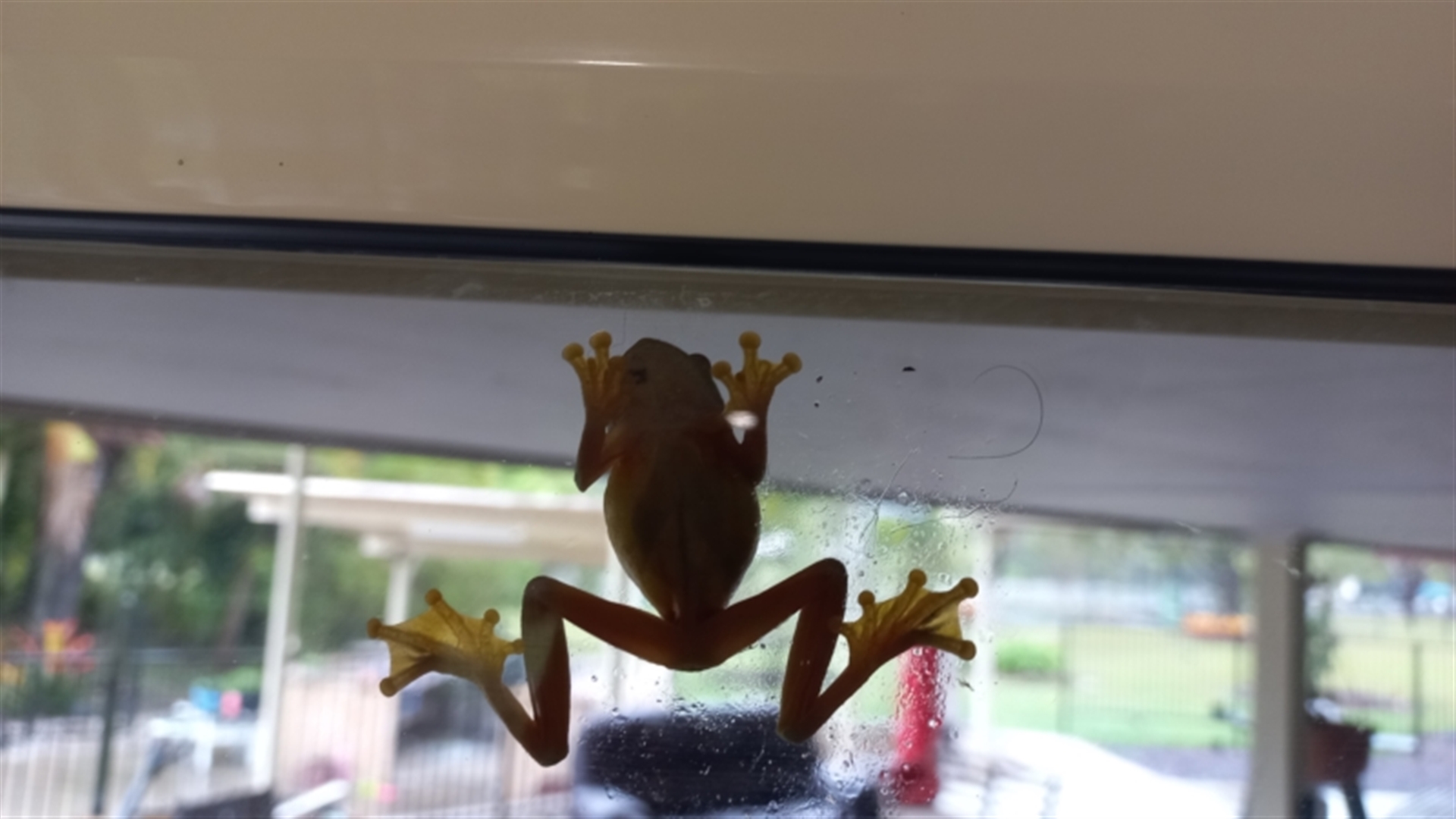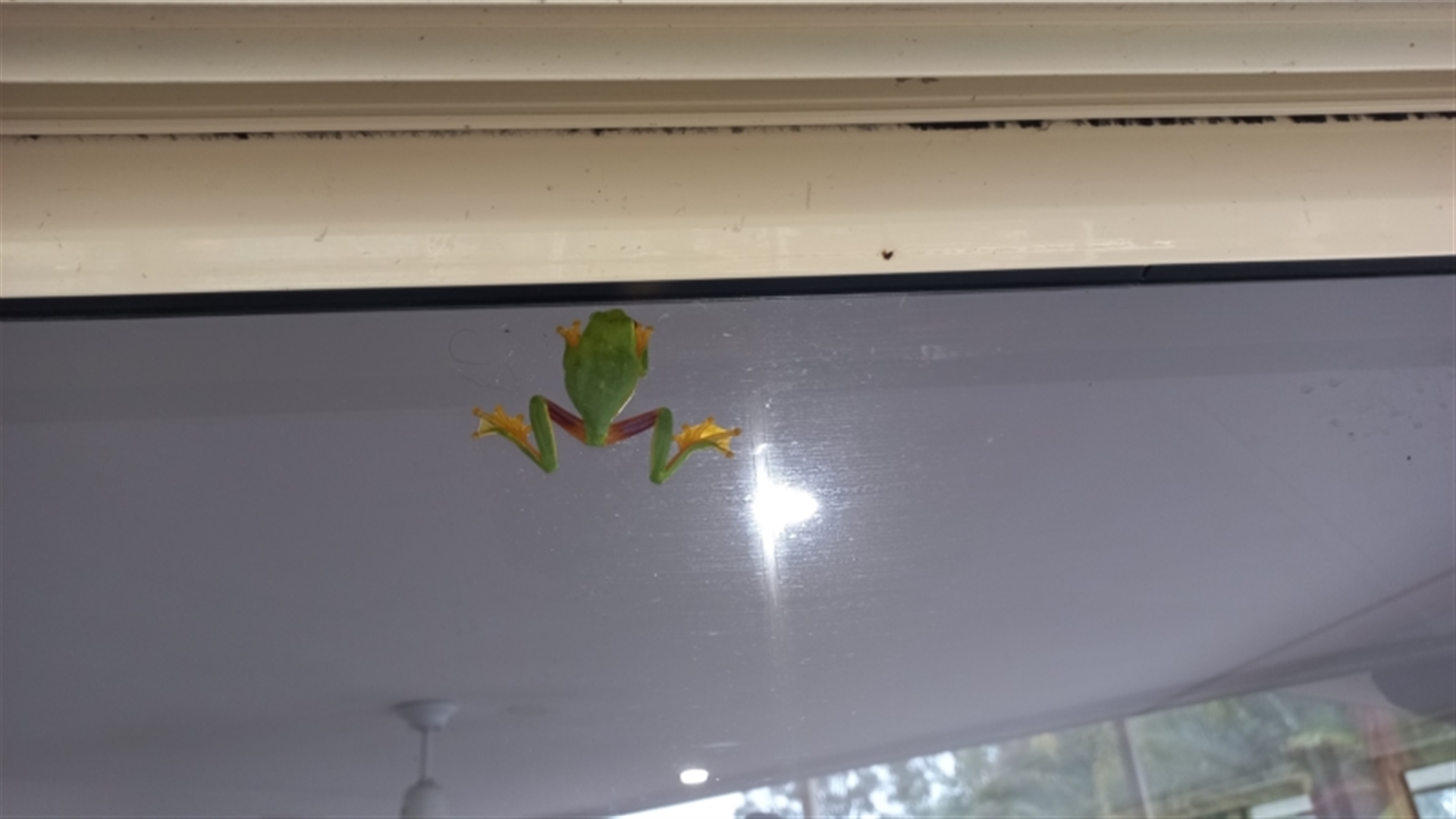 Hiding in the window recess after recent flooding.