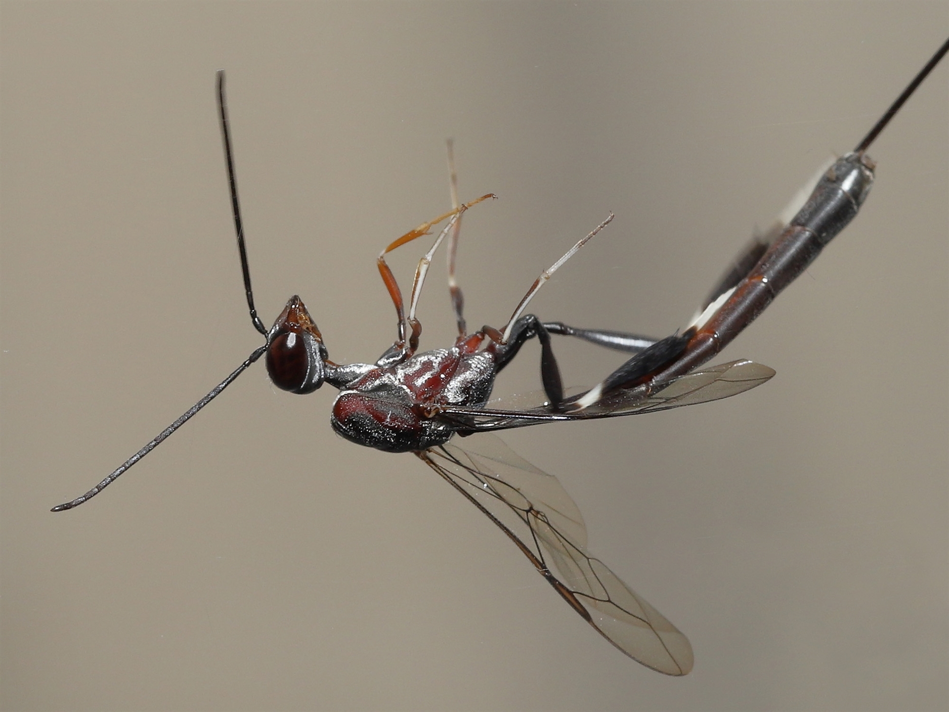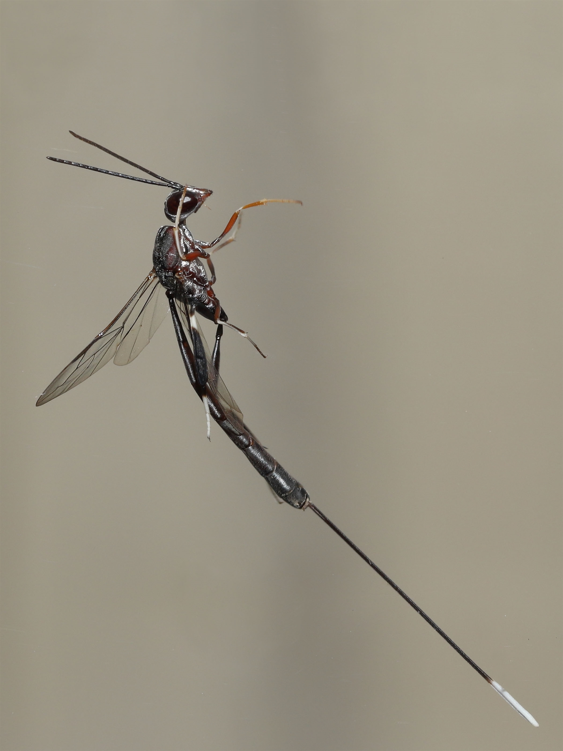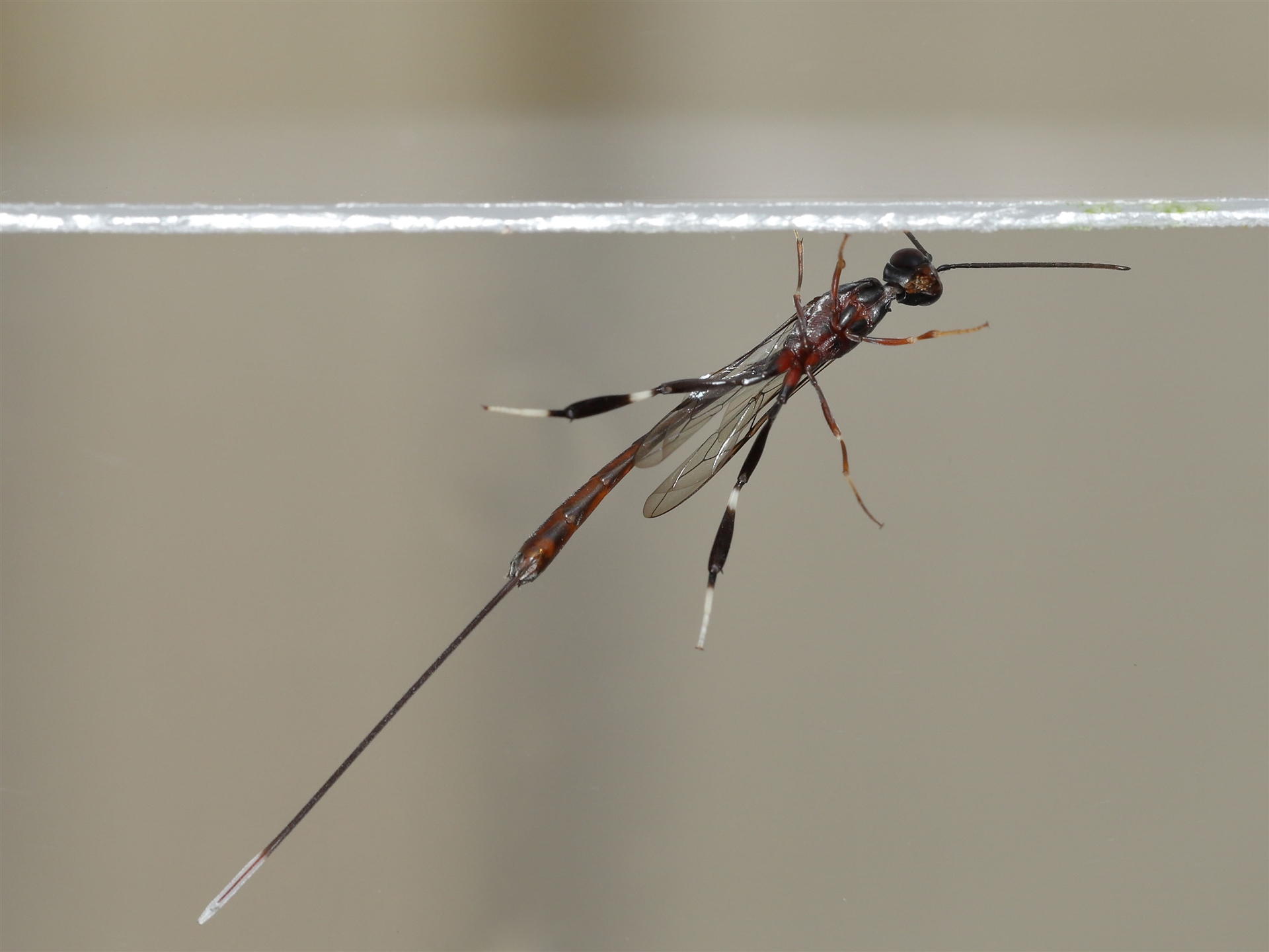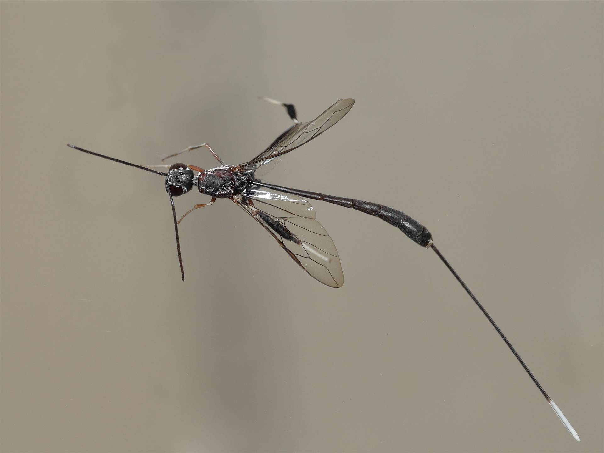 Possibly a Gasteruptiid wasp. fam. Gasteruptiidae. The overall length of the wasp was between 25mm and 50mm. Additional close up details are provided in following sighting.