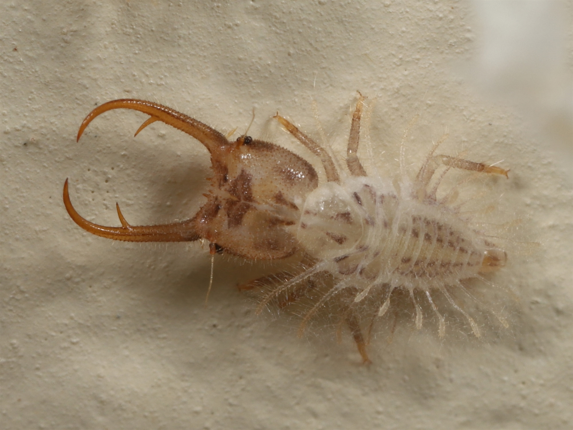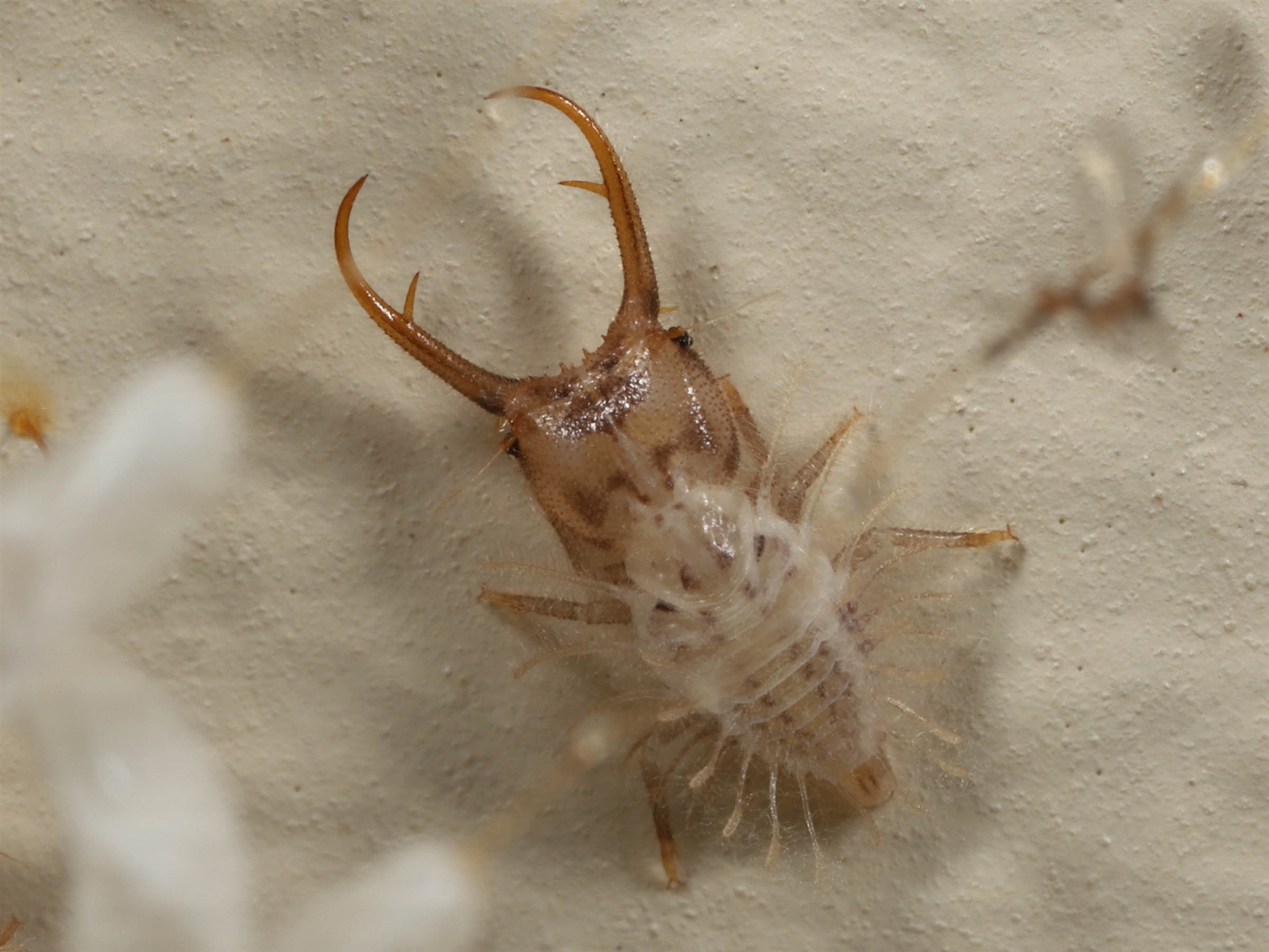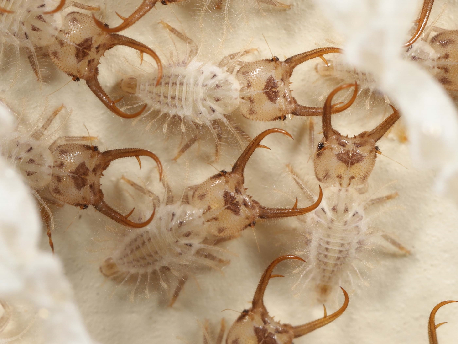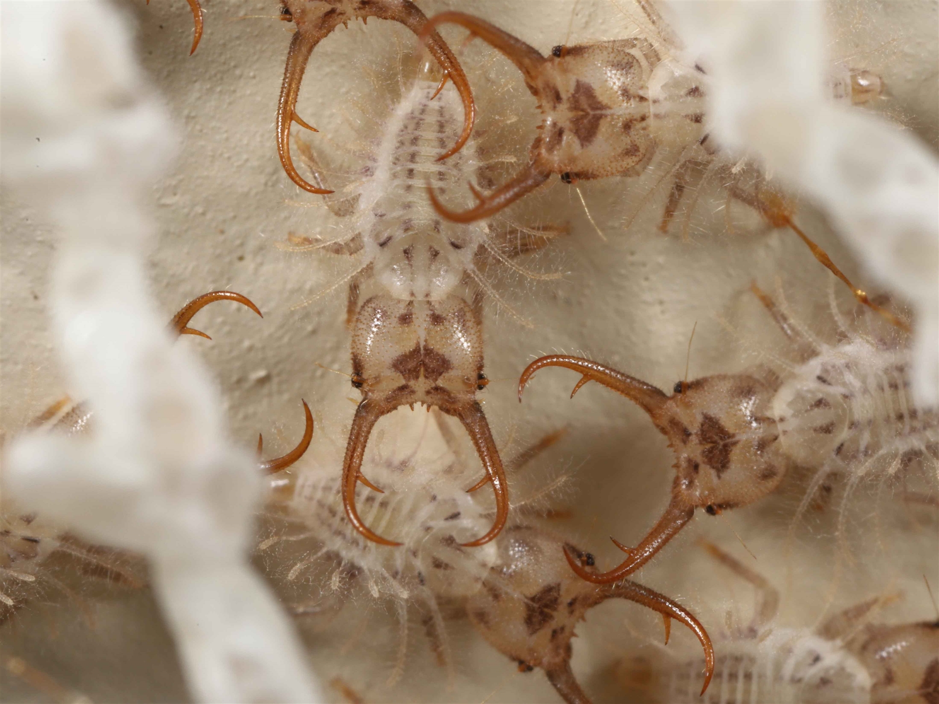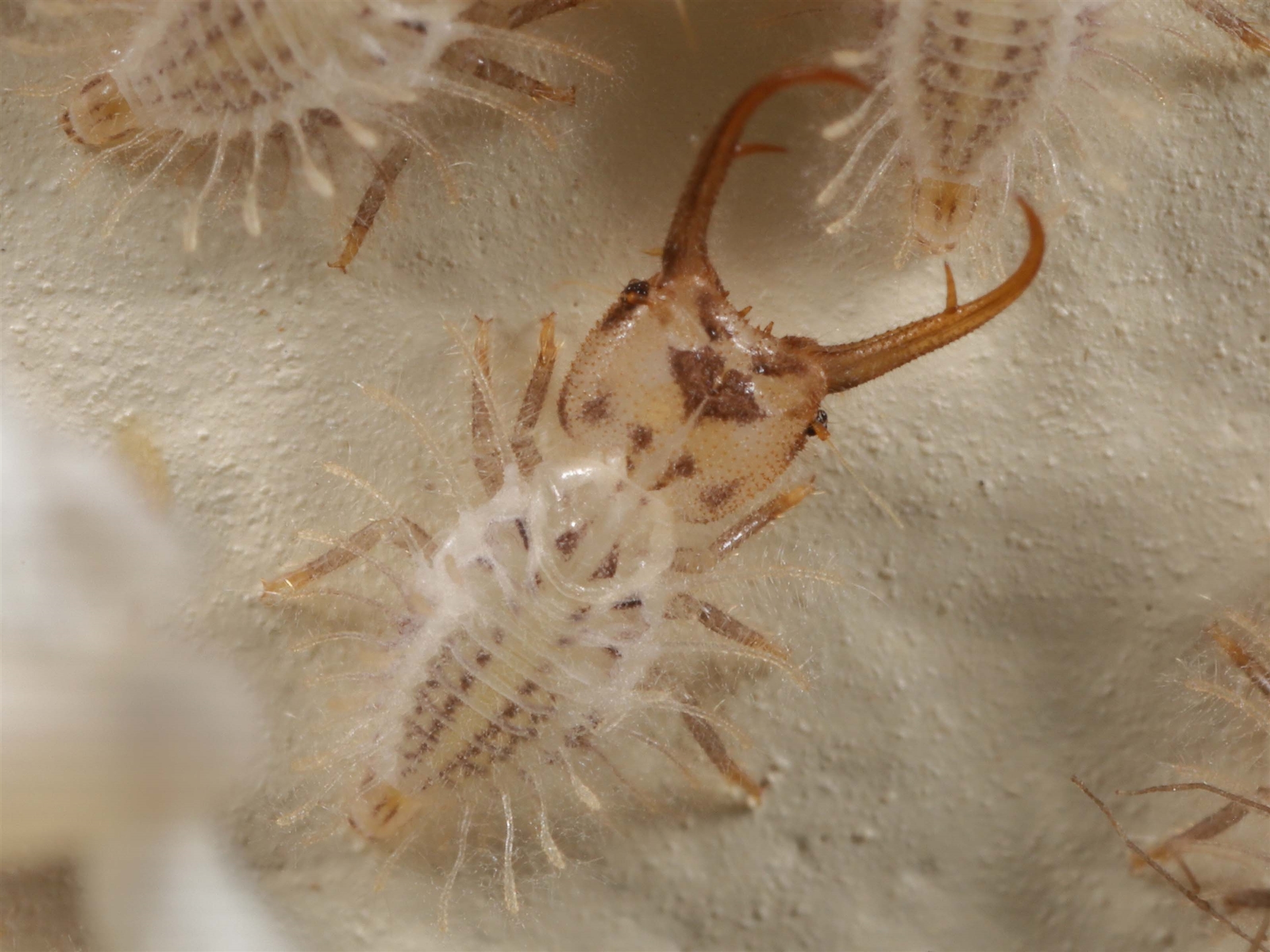 A follow-up to sighting 4472759 showing what are possibly individual Antlion Lacewing larva. Imaged at 2.5x with a very thin focal plane which affects clarity. The larvae appear to have lighter coloured camouflage structures on their backs which may mimic smaller insects. Possibly an evolved lure for potential prey?