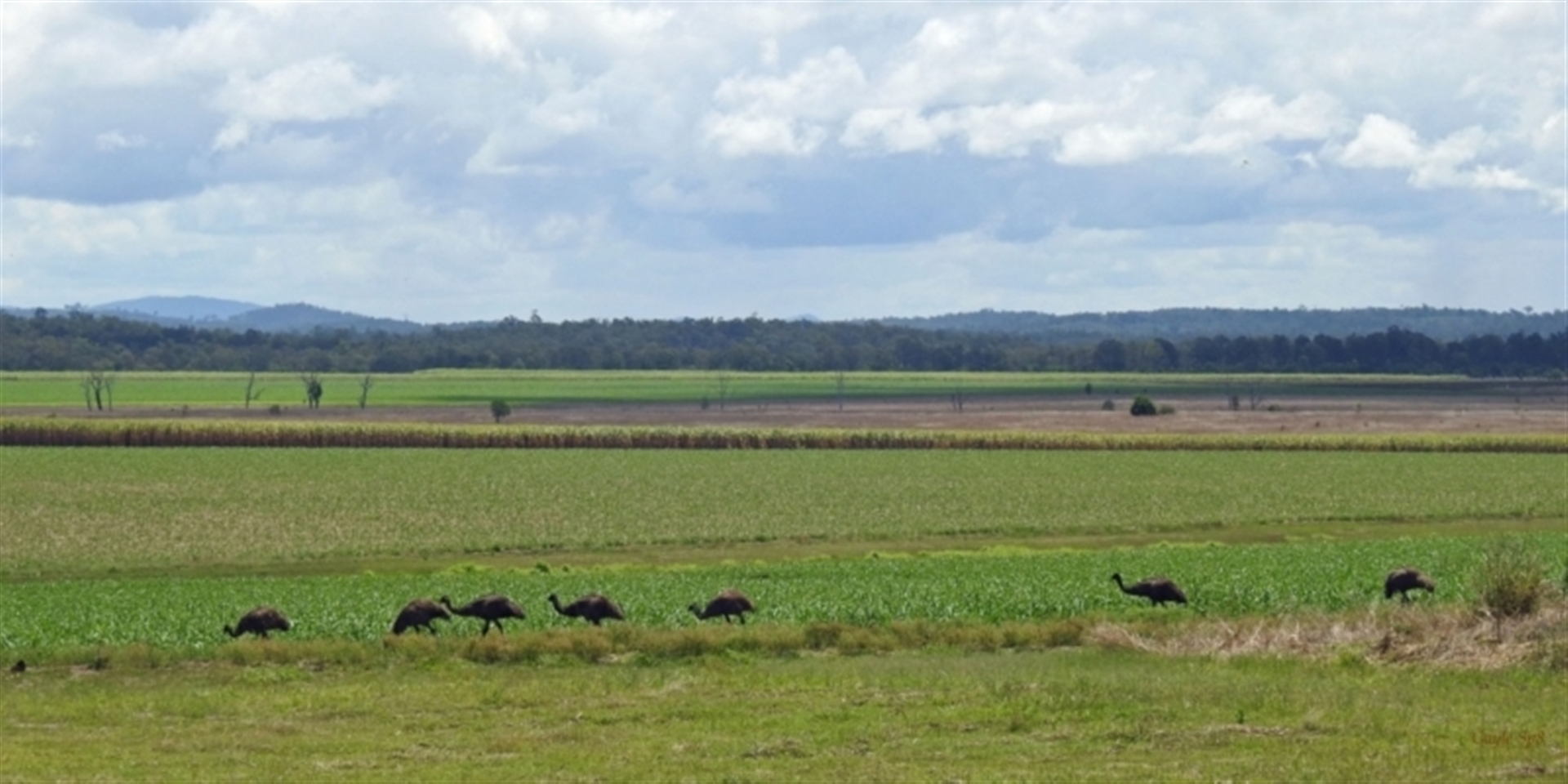 Seven emus, possibly a father with his teenage offspring. Seen from Gin Gin Cemetery, they appeared from nearby cane fields