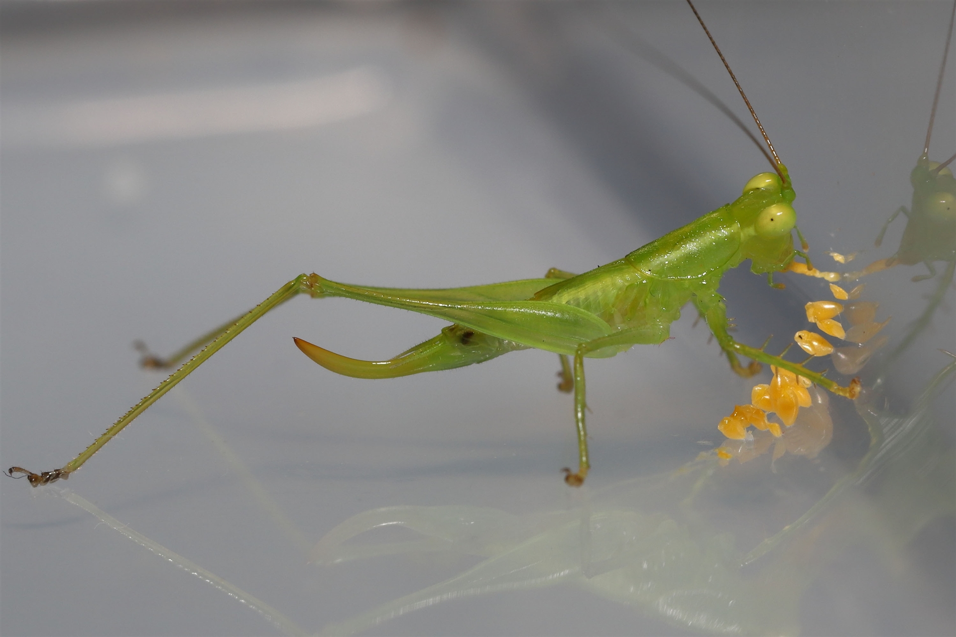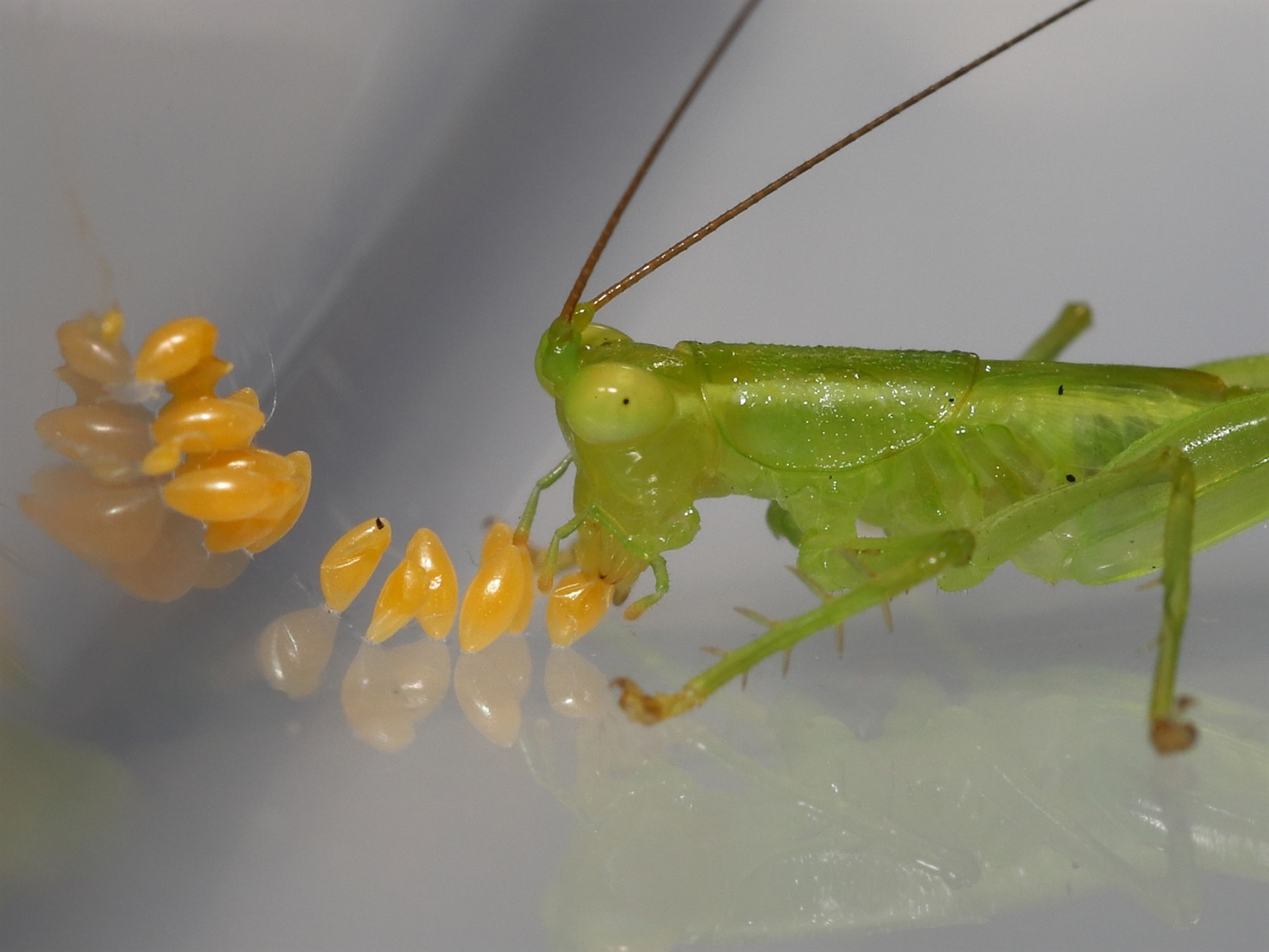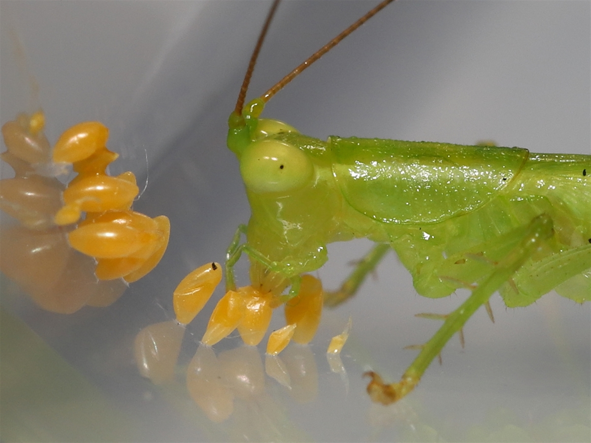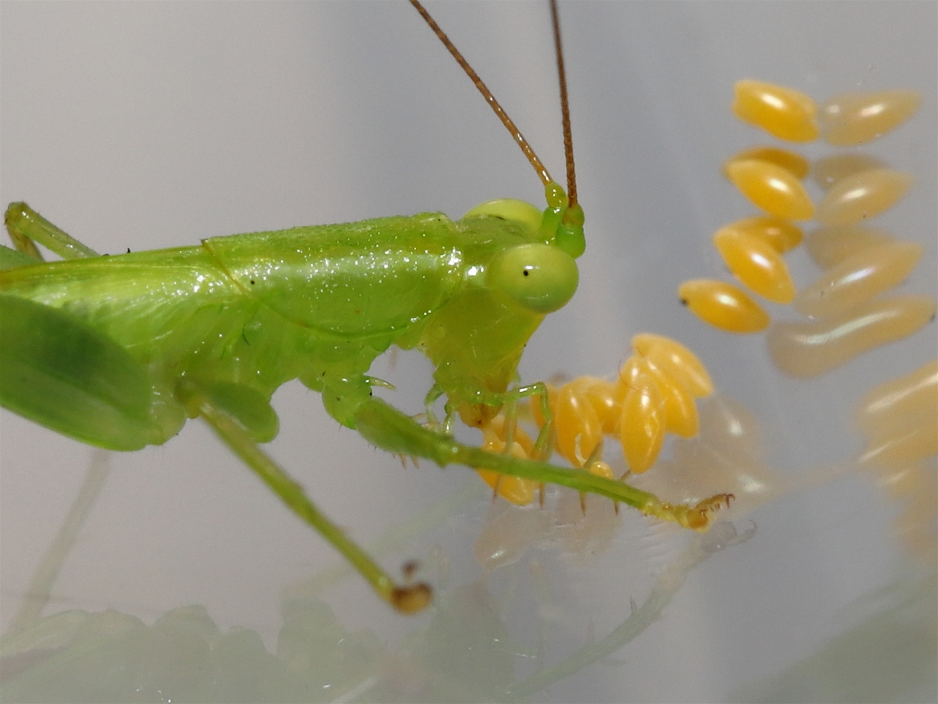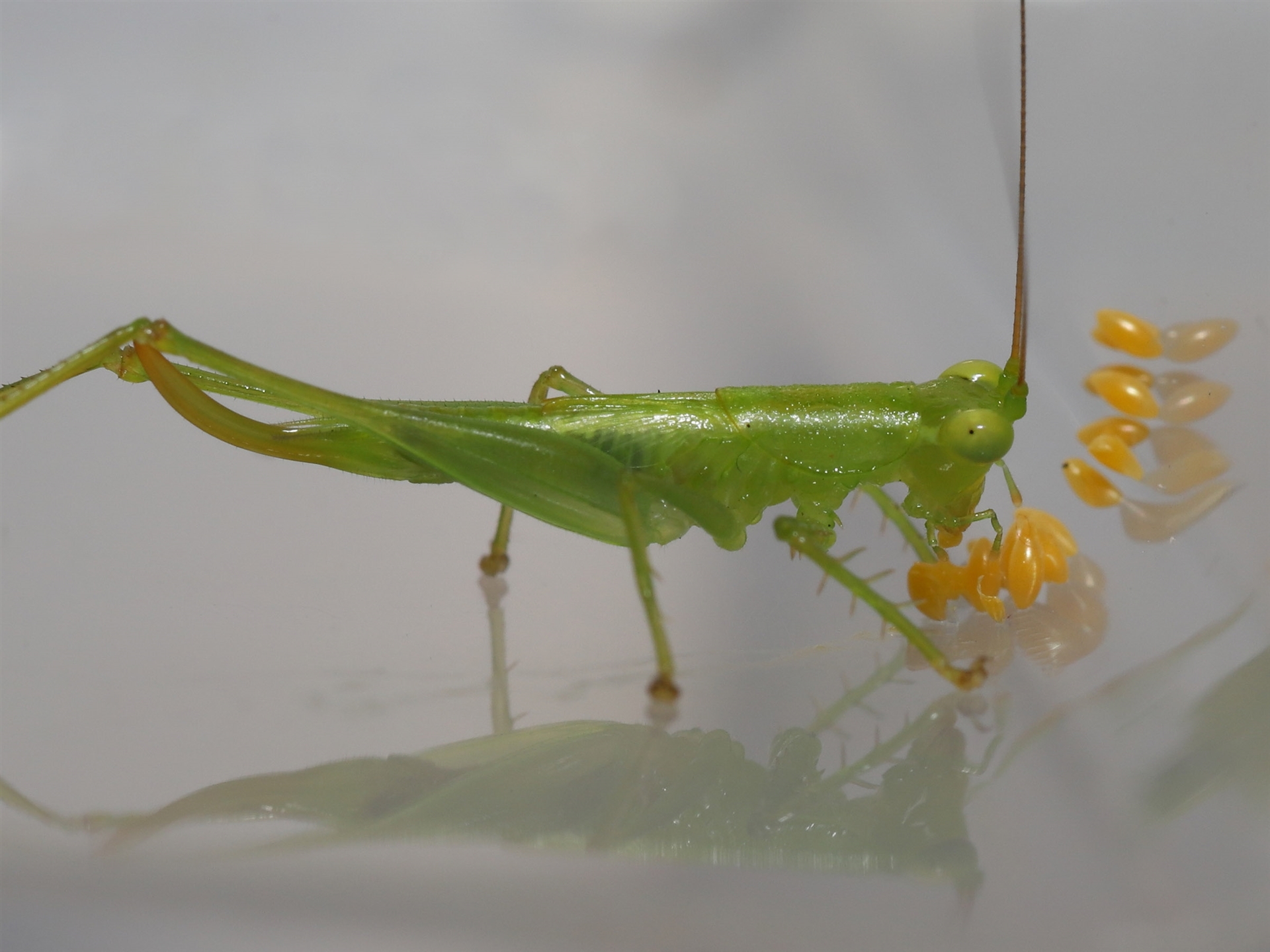 The sequence of images shows a Katydid eating Ladybird eggs that had been deposited on a container two days before.