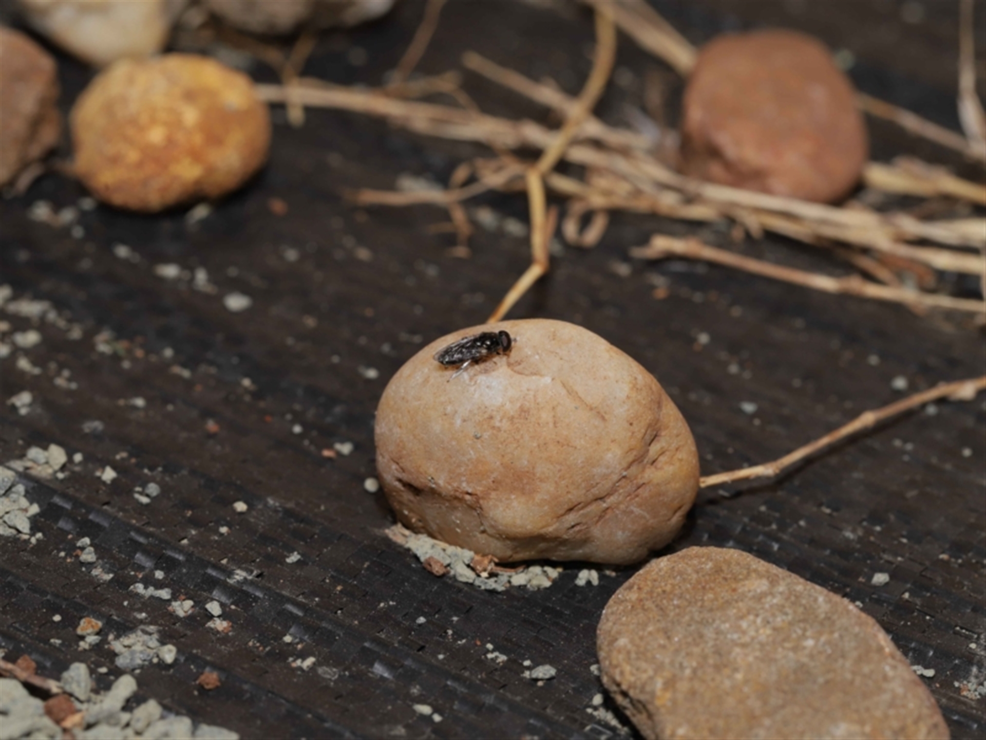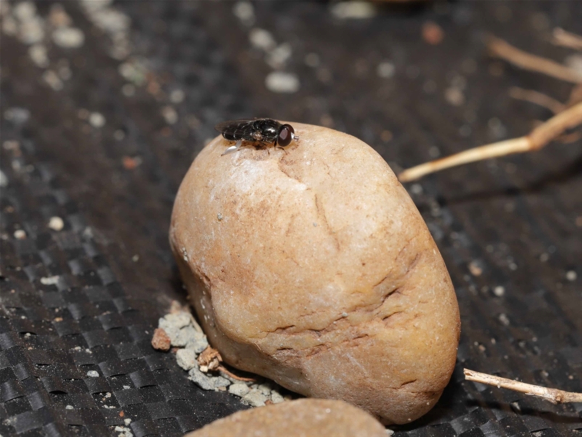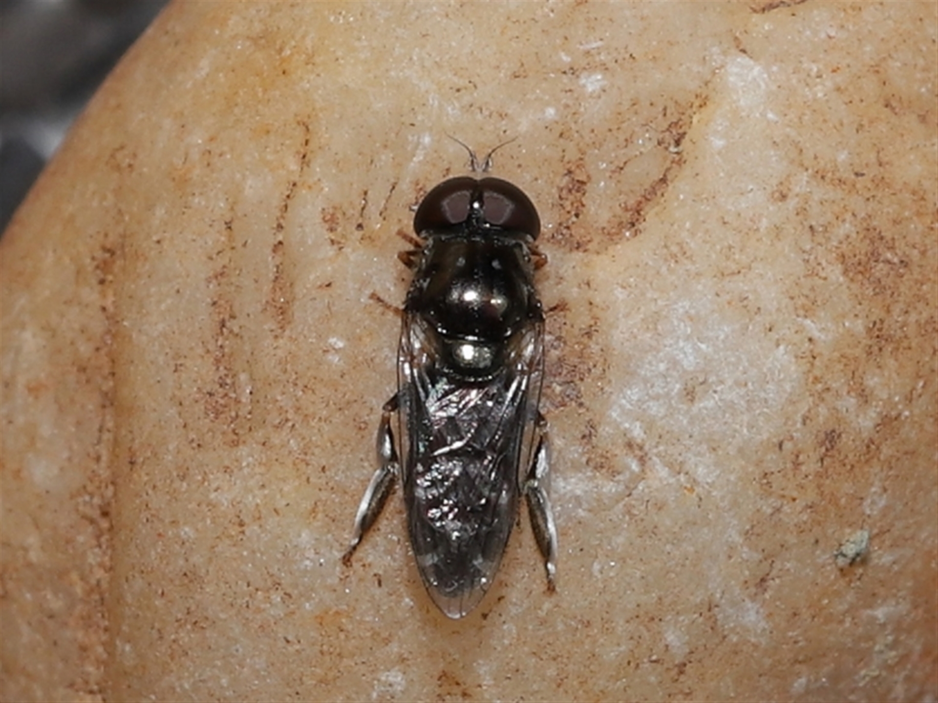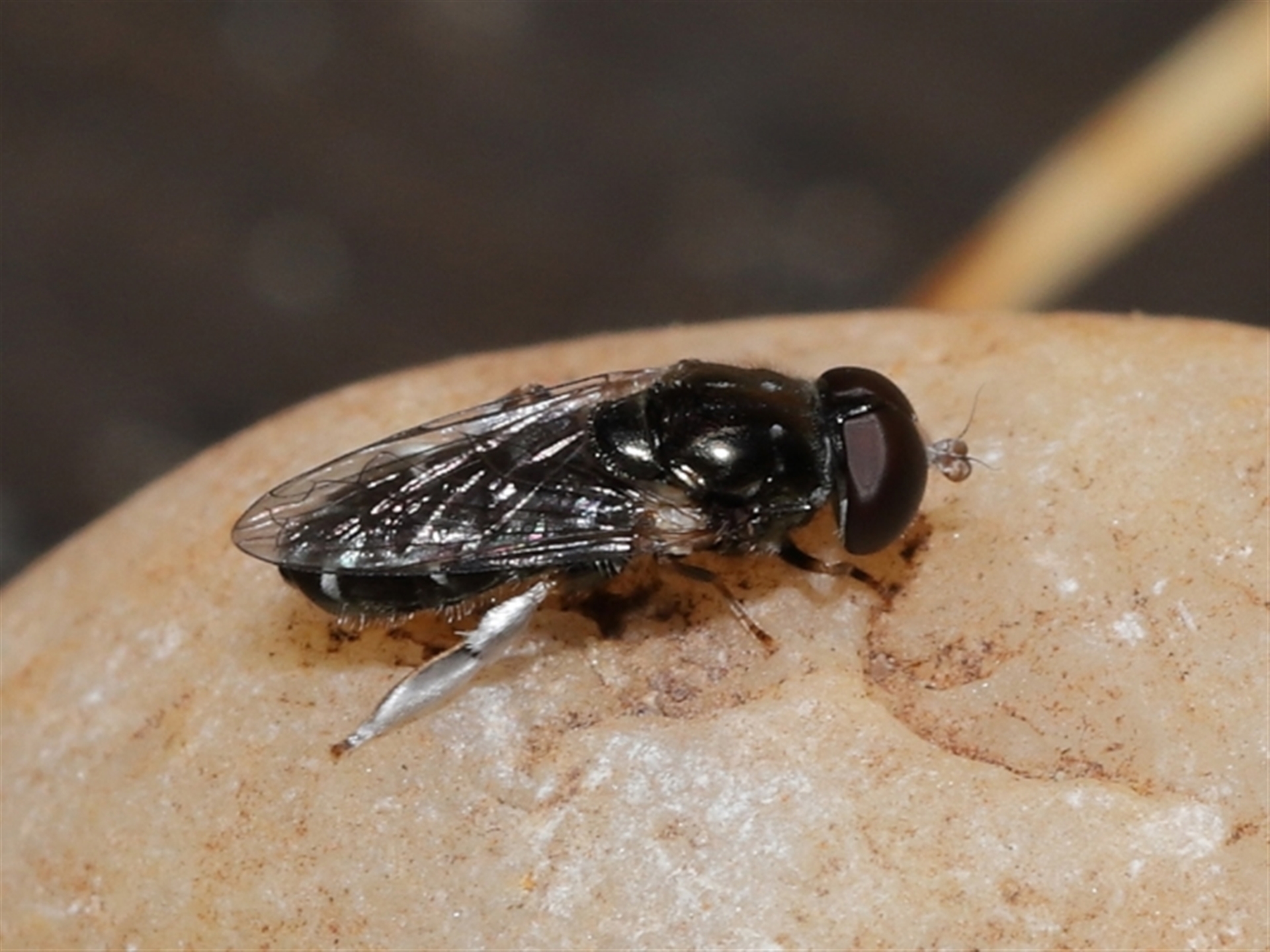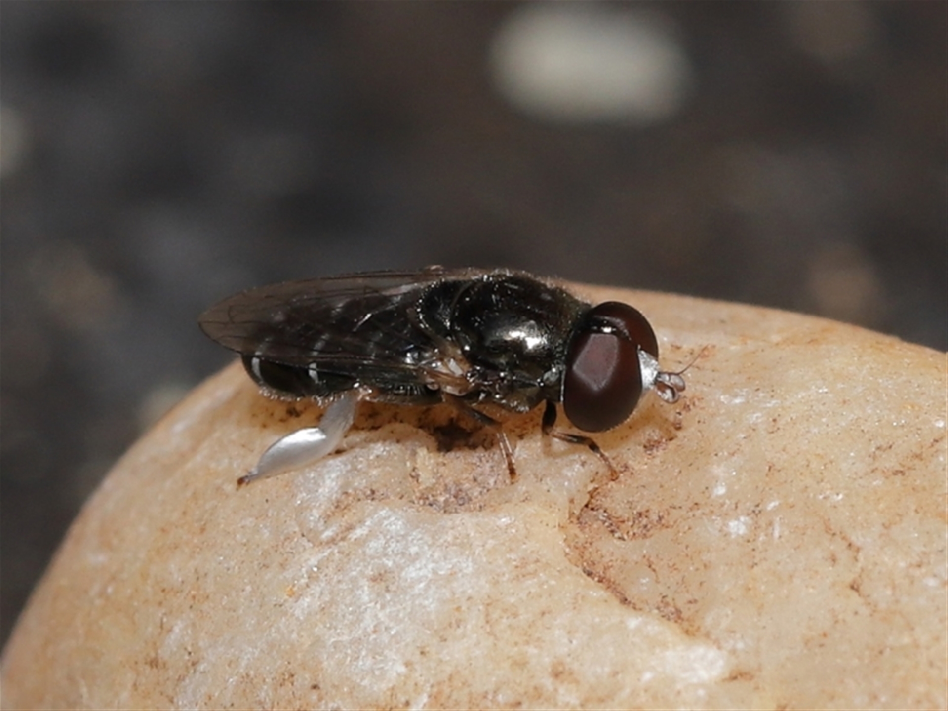 A small fly sighted at rest on a pebble. Unsure what it was. It had distinctive silver hairs on its legs and around the antennae as well as curved white stripes on top of the abdomen. Possibly some sort of shore fly?