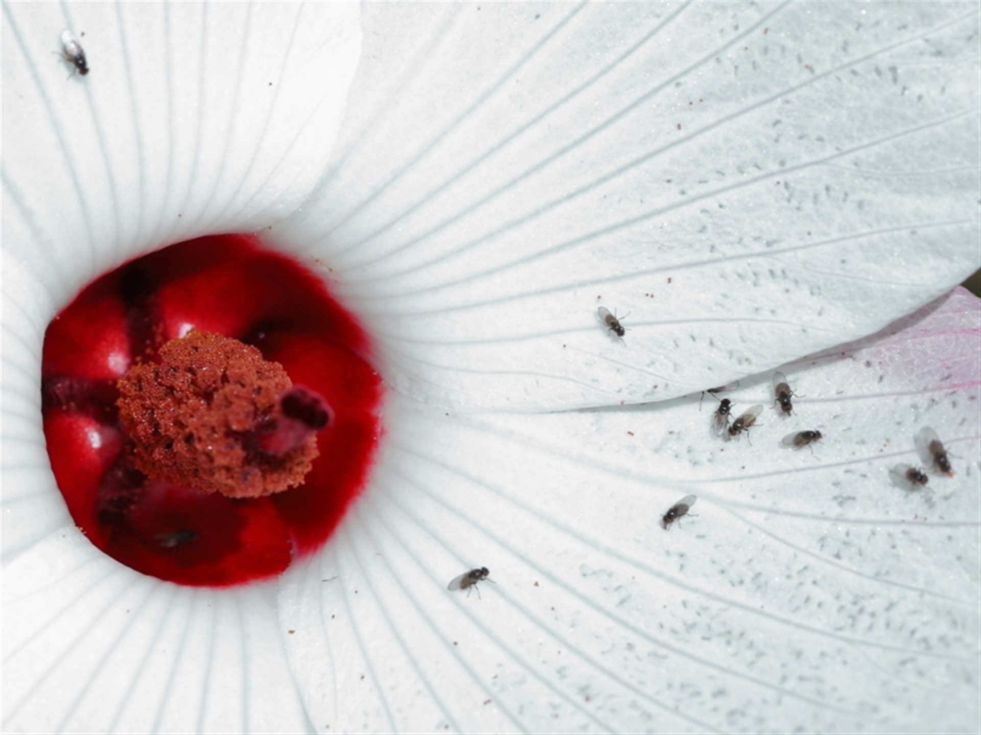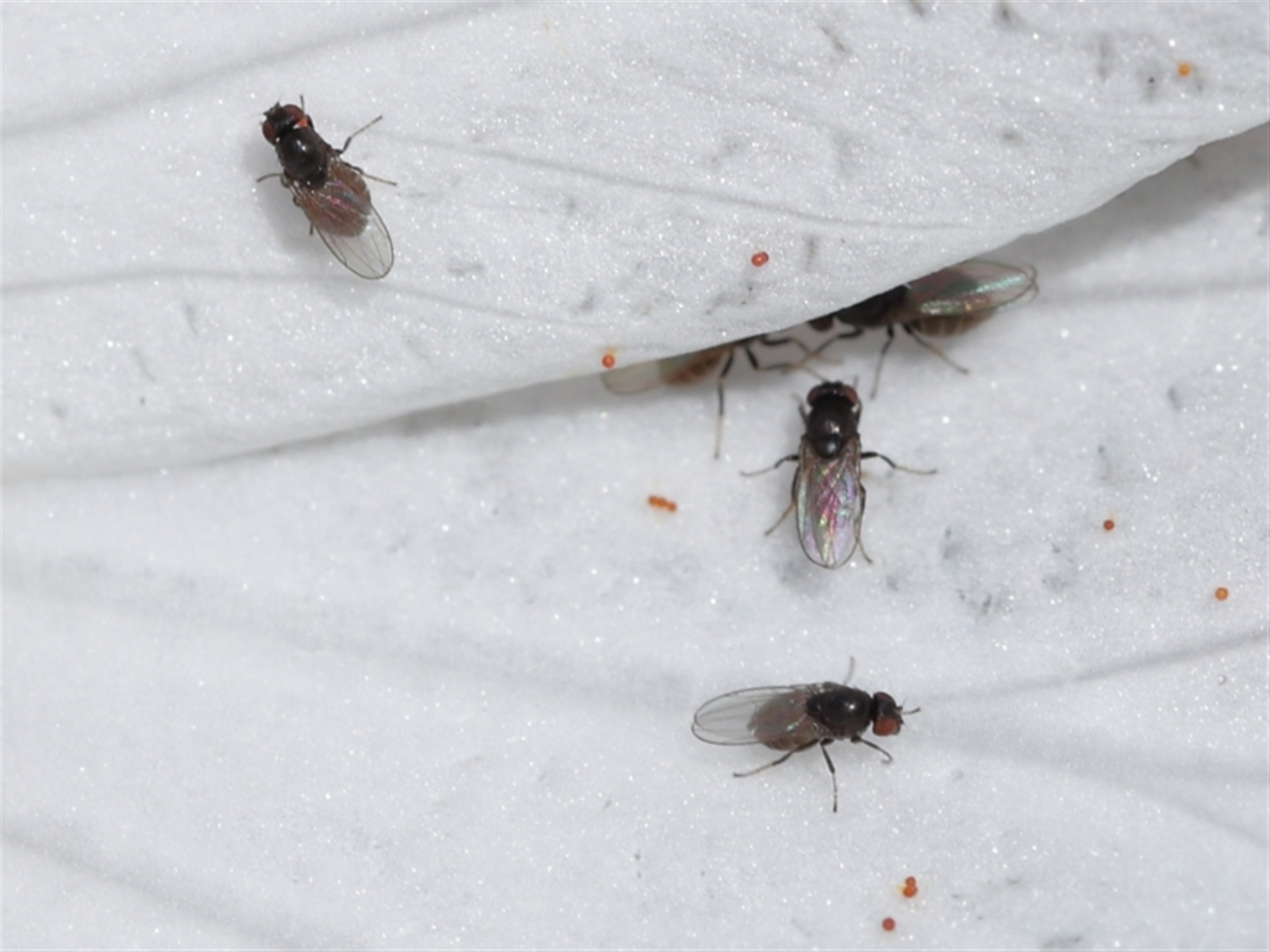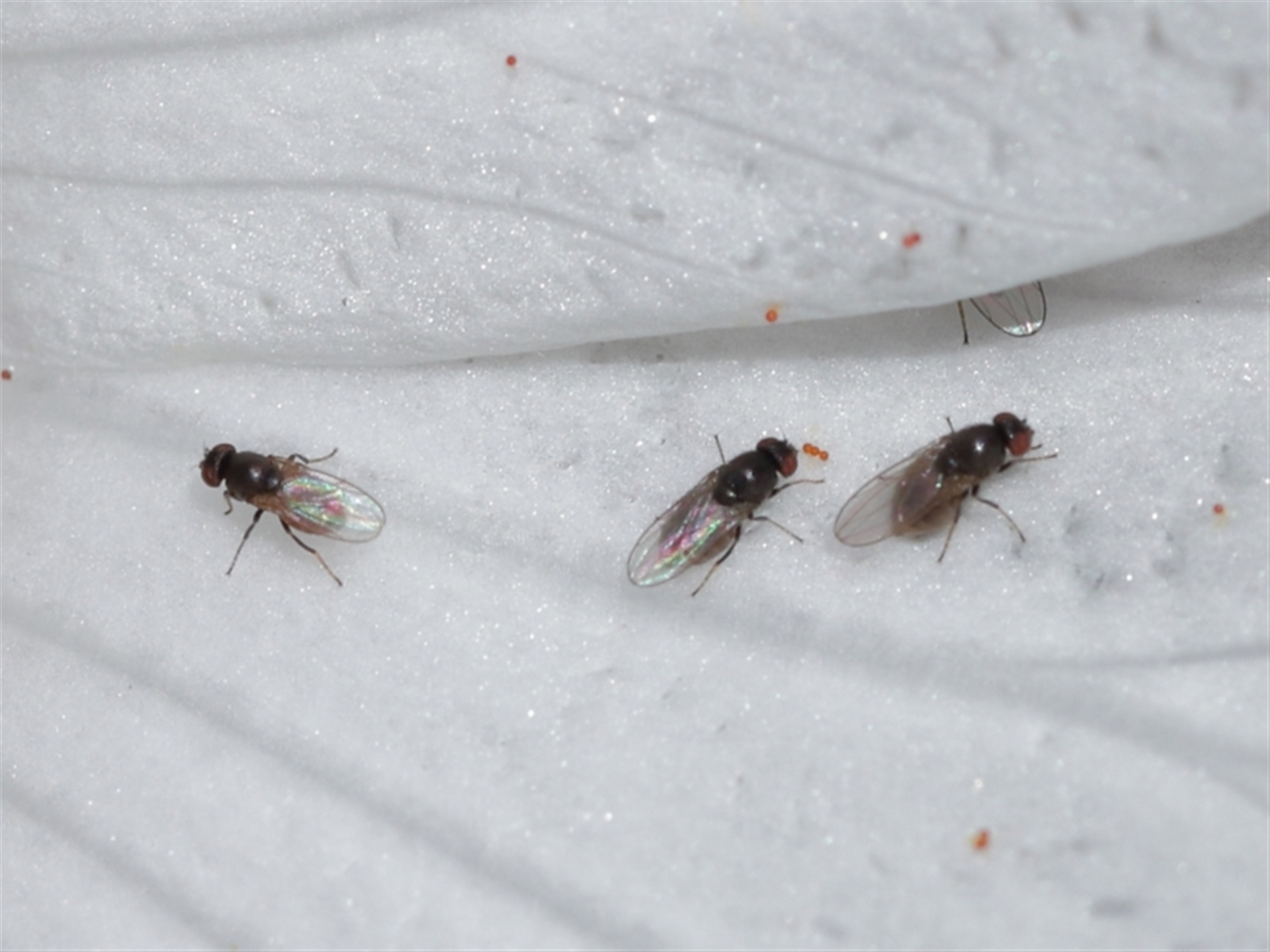 The flies appeared to be collecting pollen grains with their mouthparts before flying away. Pollen grains were attaching to their bodies in passing so by default they were pollinators.