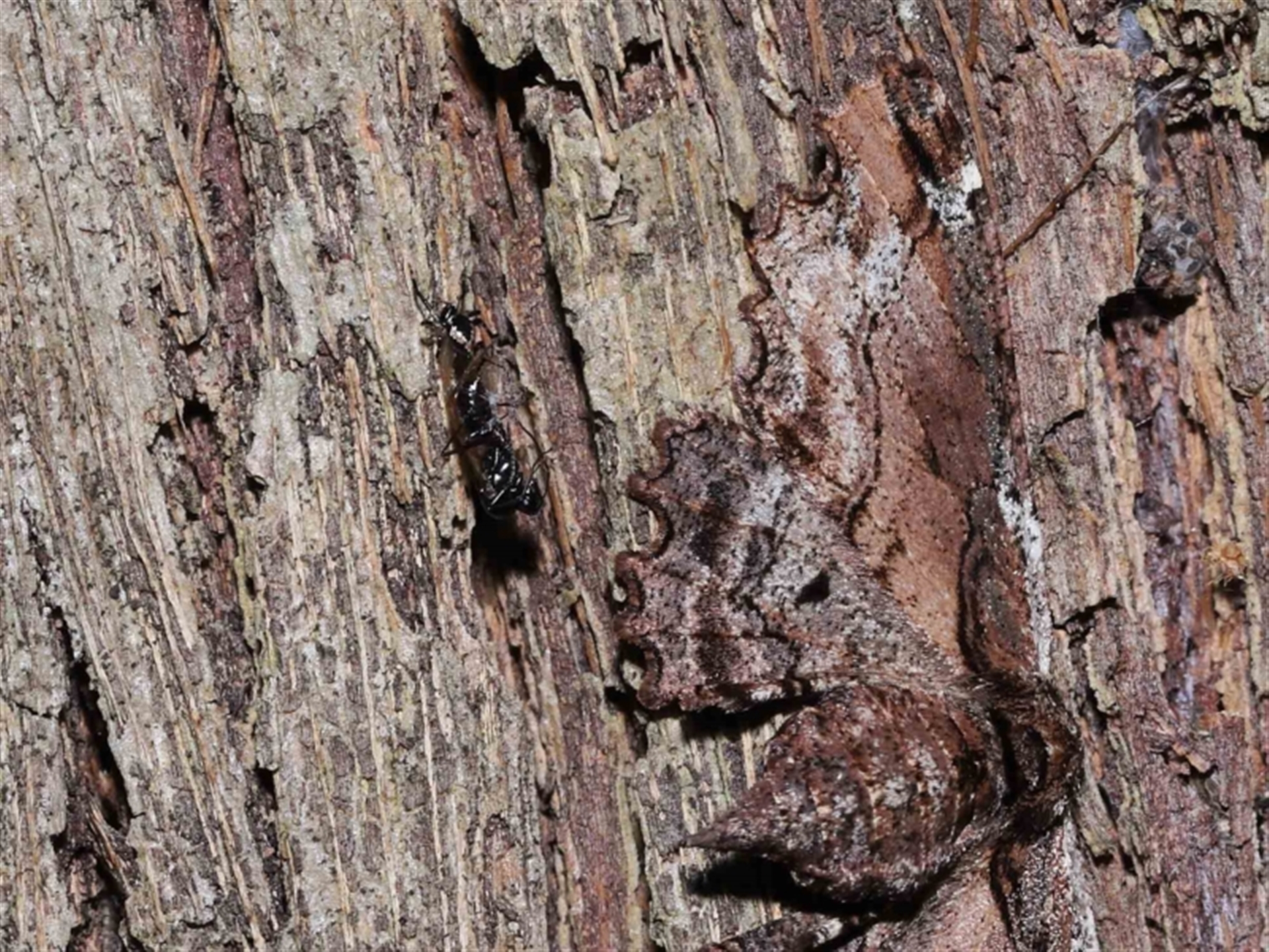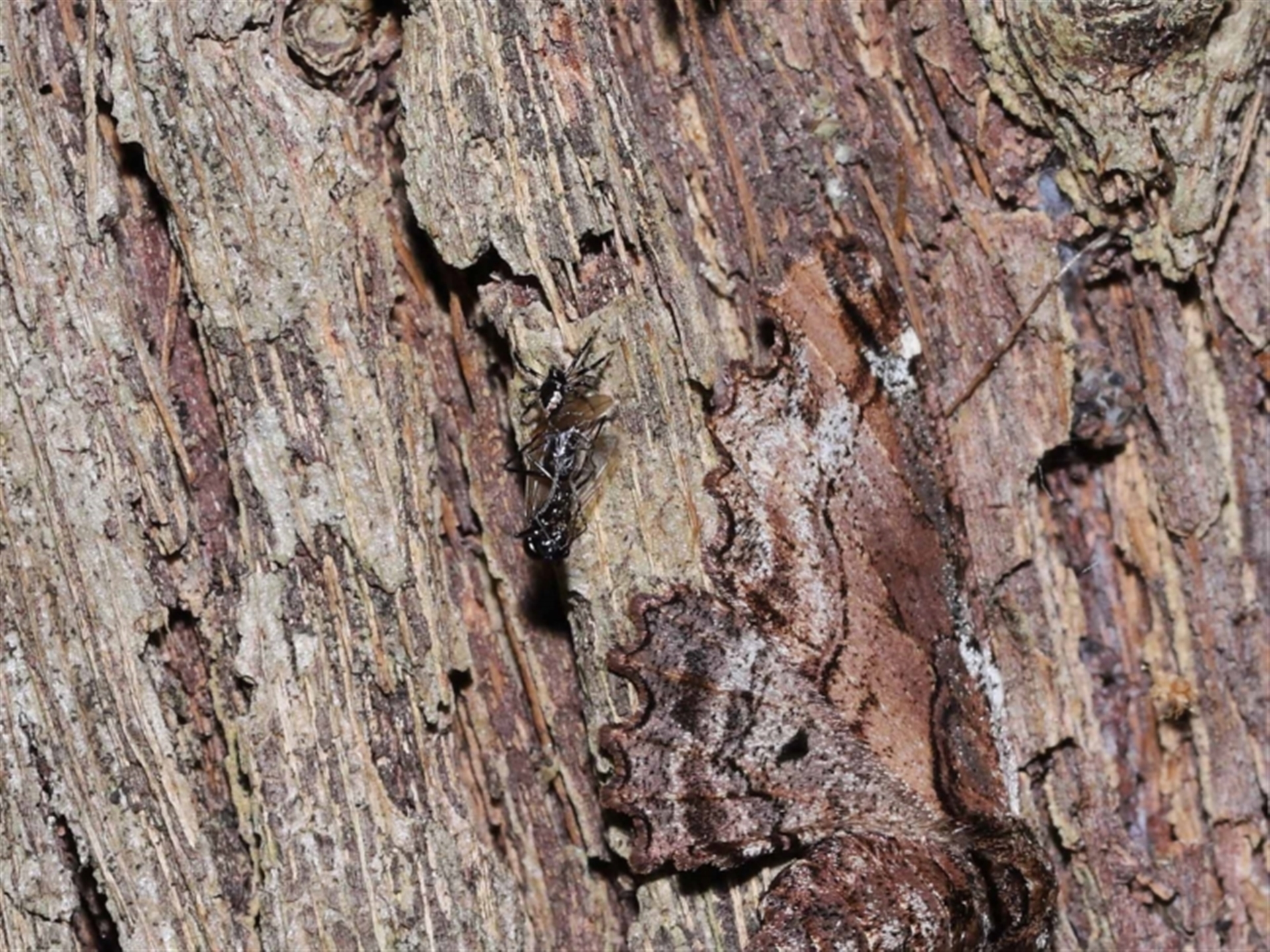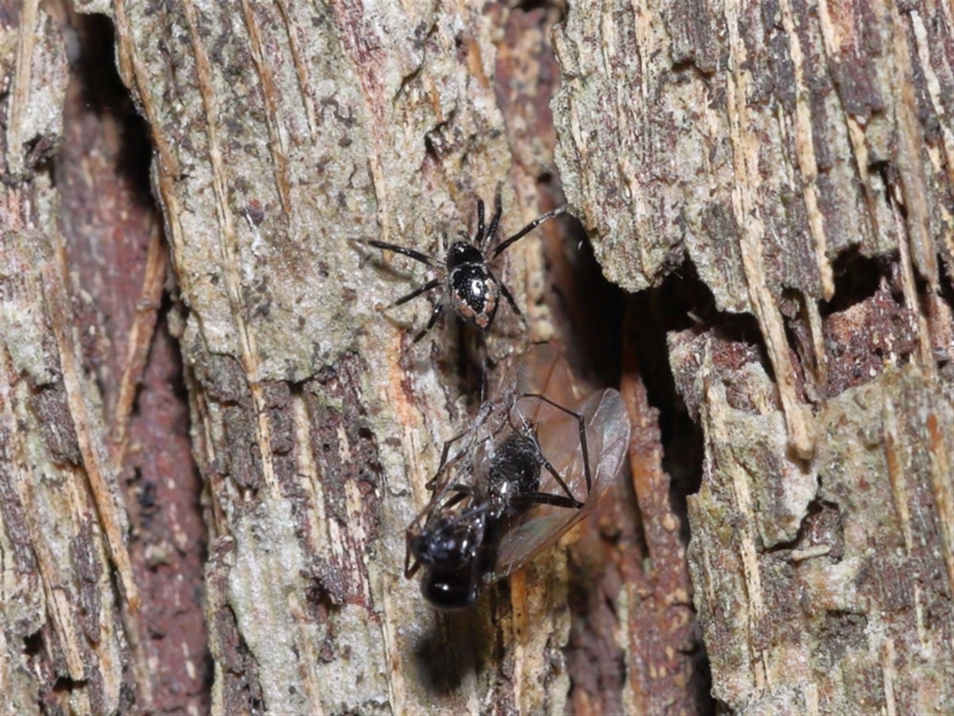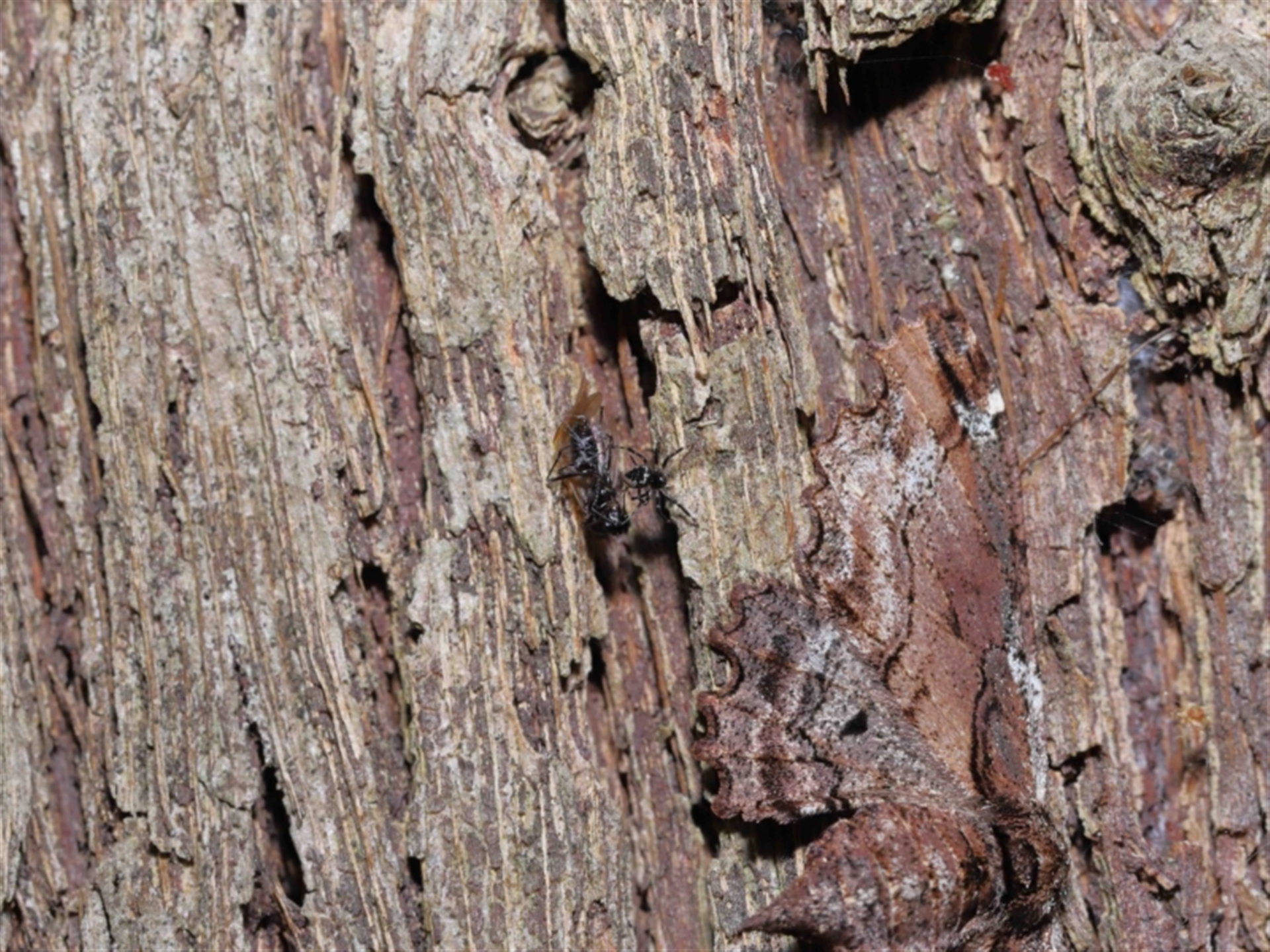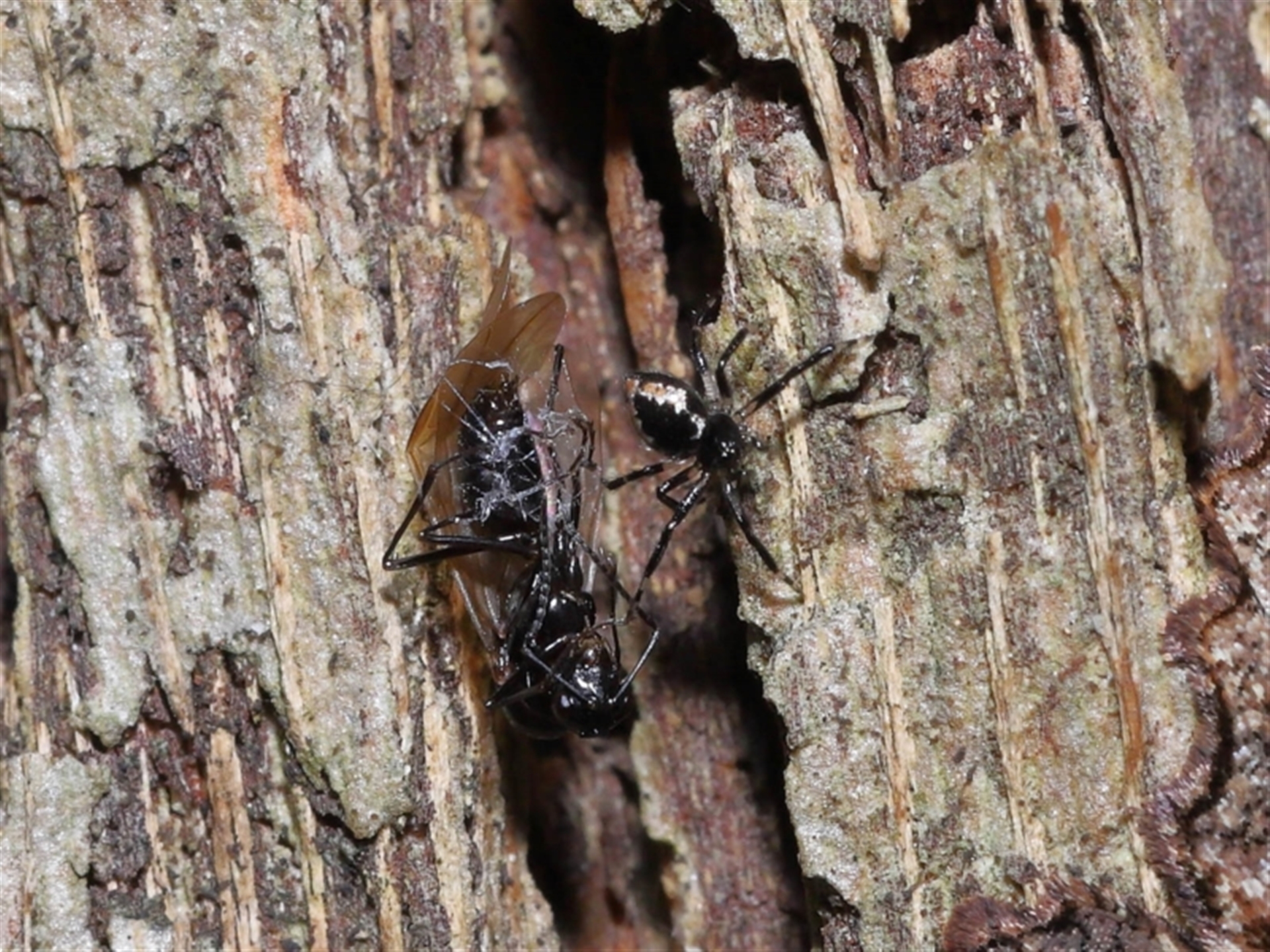 Thanks to Barbara for the initial sighting of the spider with its prey, a winged ant. The third to fifth images show a moth hiding in plain sight adjacent to the spider. At one time the spider dragged the ant over part of the moth's wing with no reaction. The moth is shown in following sighting 4504893.