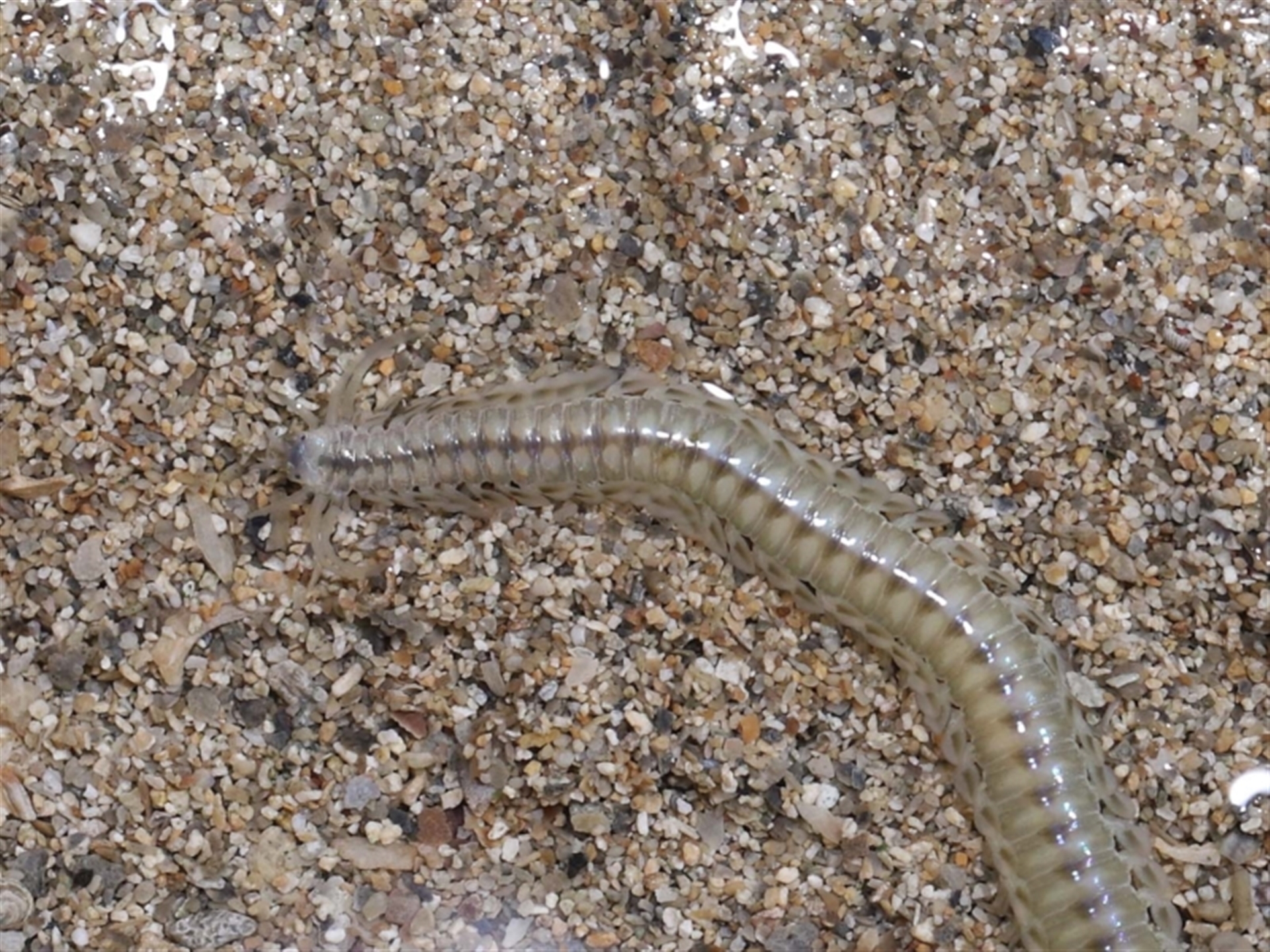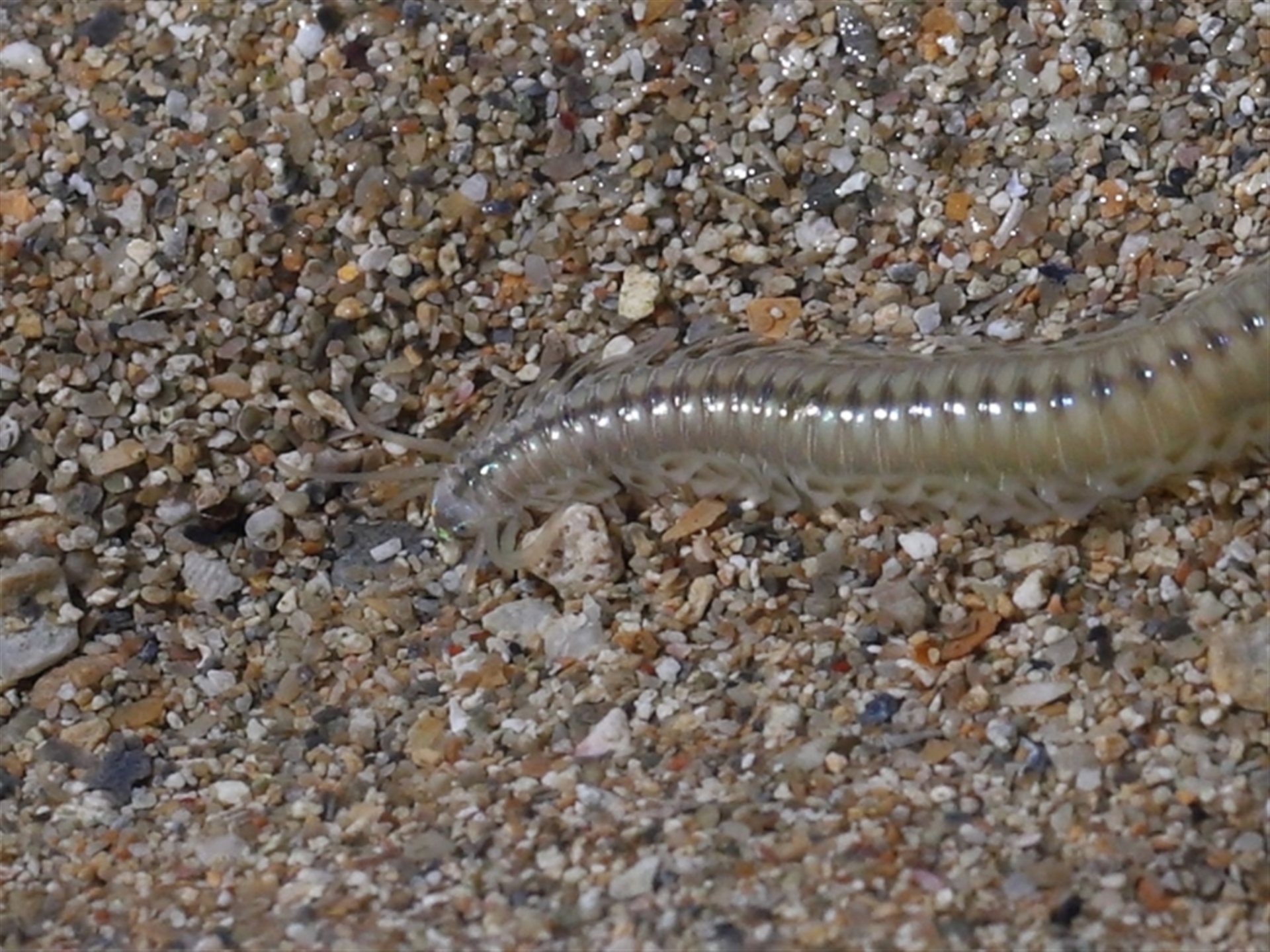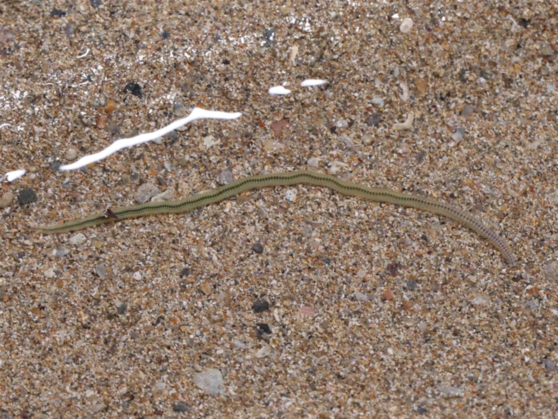 Three widely separated groupings of these creatures were seen across the flats during low tide. They had the appearance of centipedes, presumably some aquatic form. They were all in very shallow pools of water and typically within close proximity to each other but with no interaction. The largest group had 6 individuals, none of which took any notice of us being close by. The head end is seen in the final two images and the approximate size can be gauged from the third image. Thanks to Barbara for the initial sighting.