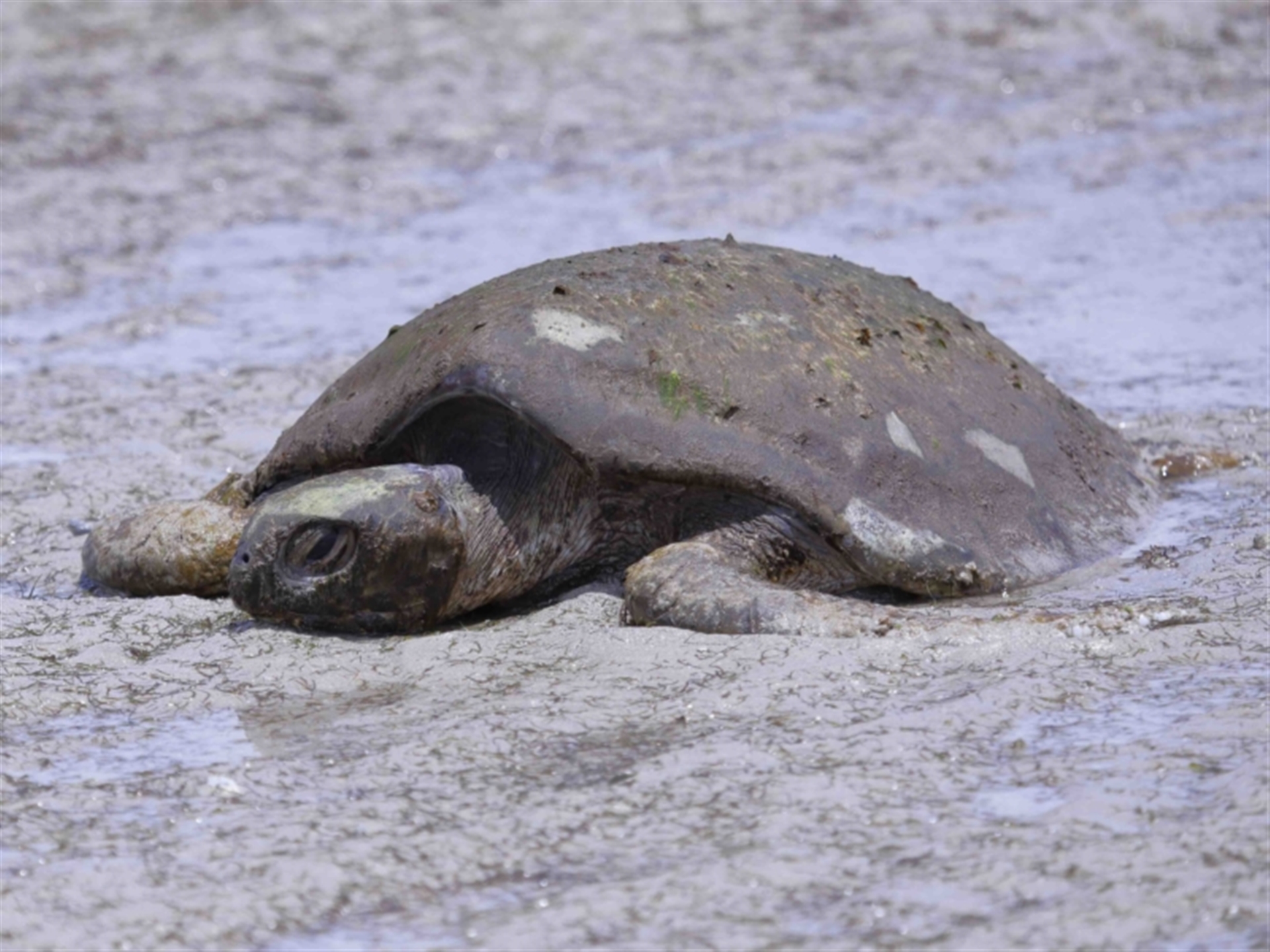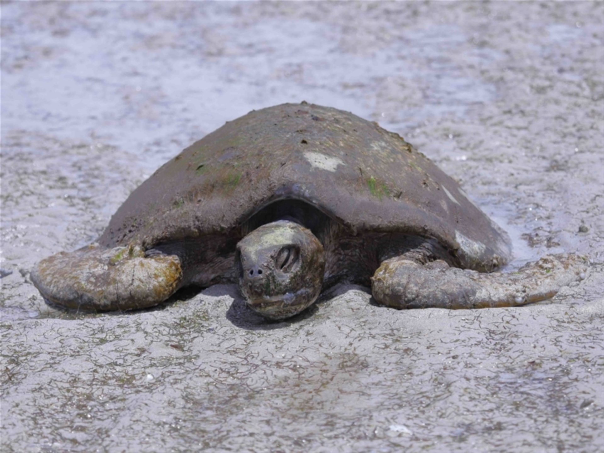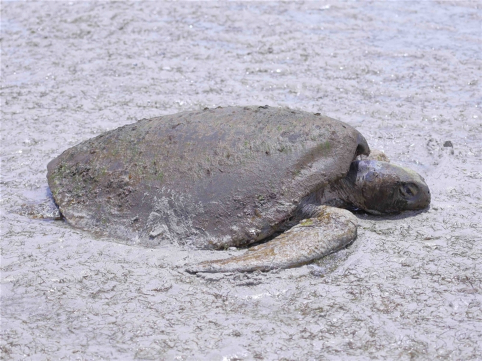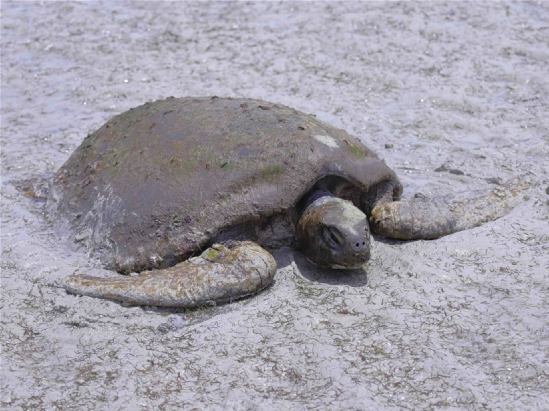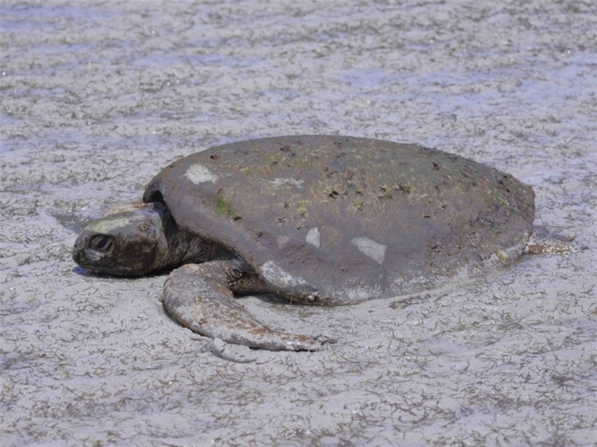 The turtle was originally found stranded on the sand flats at low tide, out past King Island. The turtle was clearly unable to move its weight across the sand flats and appeared to be suffering from exposure to the hot sun. Eventually some other people joined us, and the consensus view was that the turtle was not obviously sick or injured and had most likely become stranded on the flats when caught out by the receding tide. Two of us eventually carried the turtle back to the water’s edge and carefully released it into knee deep water. The turtle immediately swam away from us with strong strokes, into deeper water. It was last seen some distance from the shore, regularly raising its head above the surface to breath. Additional details of the turtle are provided in following sighting 4526610. Thanks to Barbara for initially finding this wonderful, ancient looking creature.