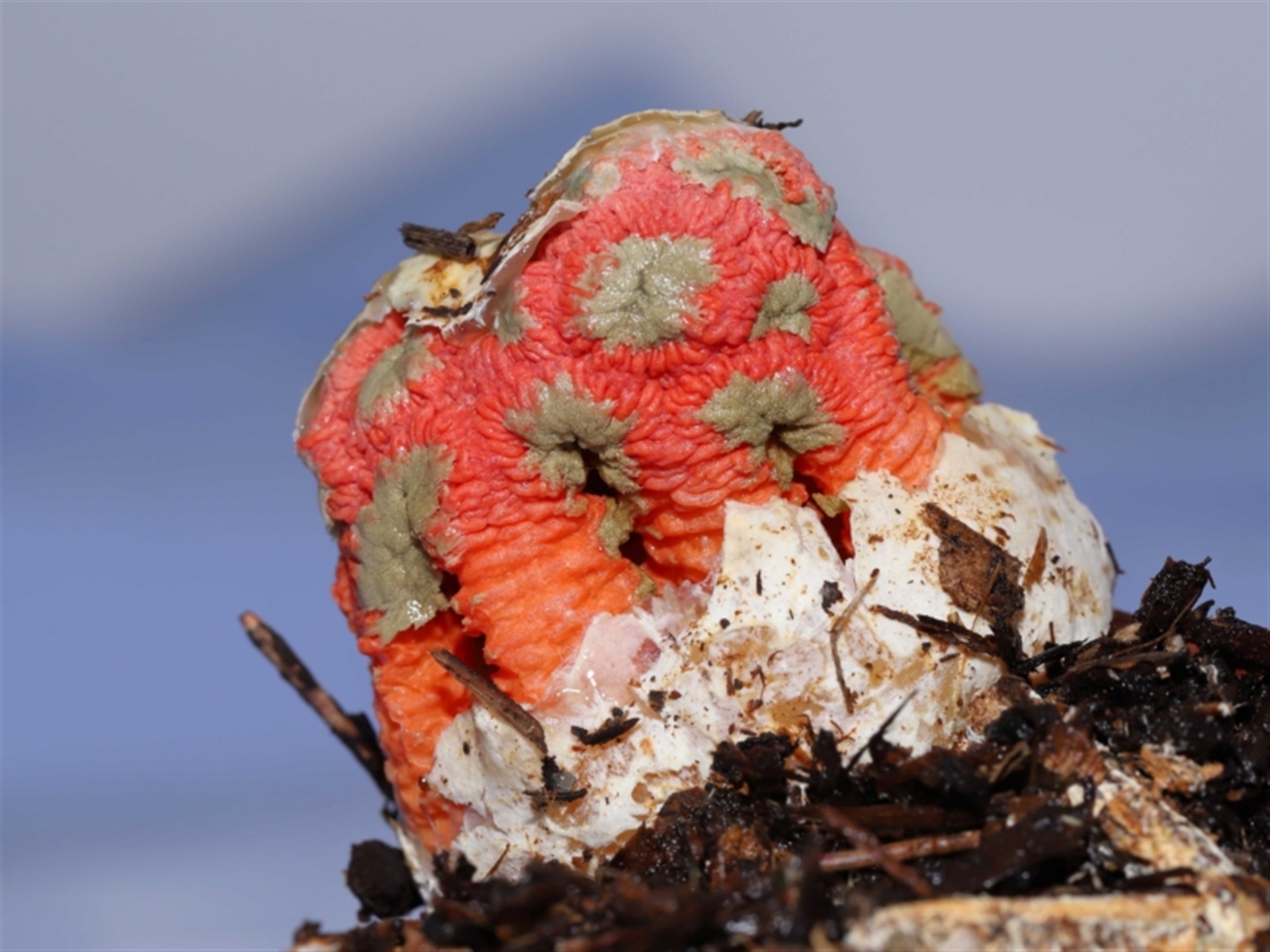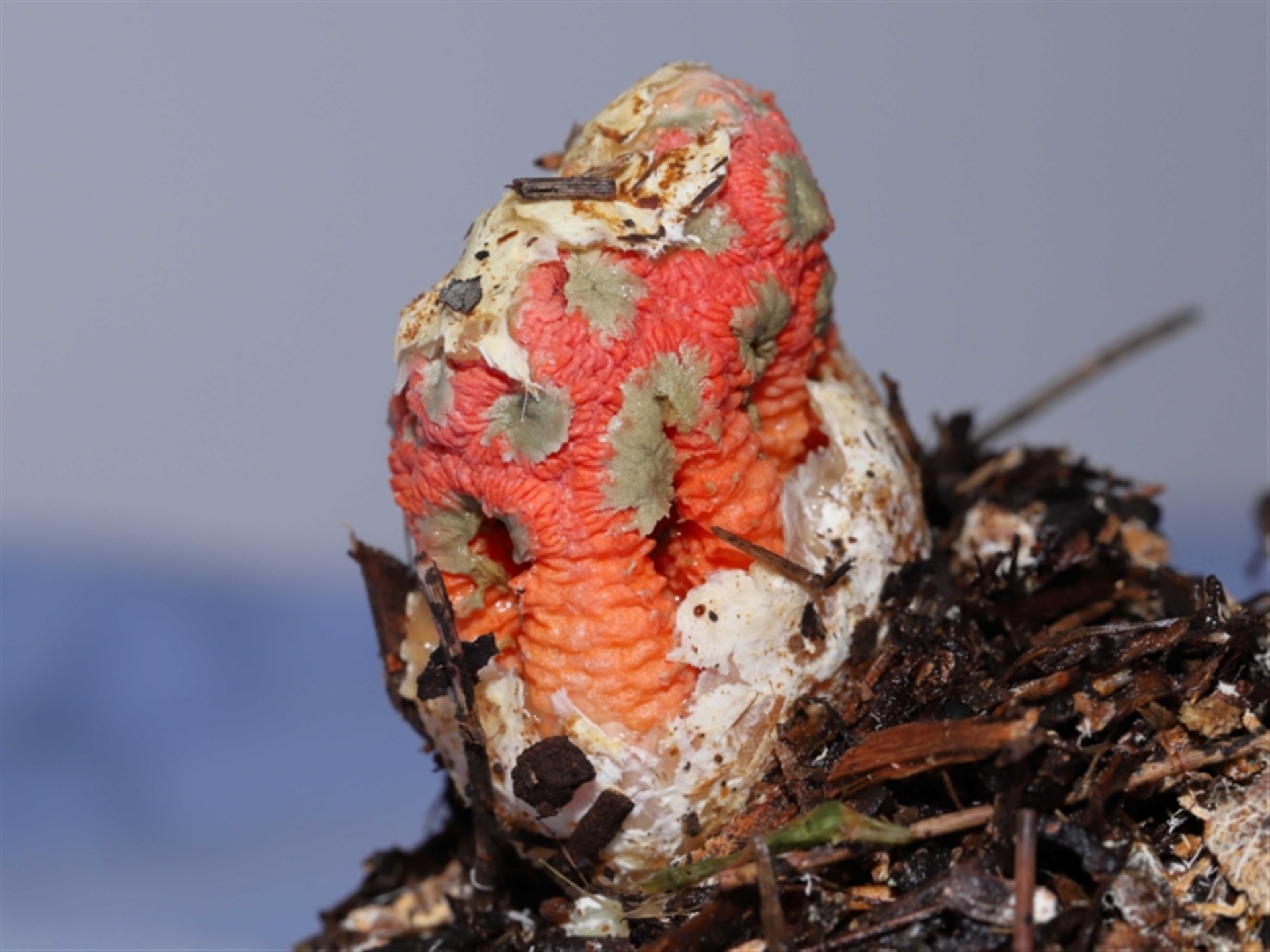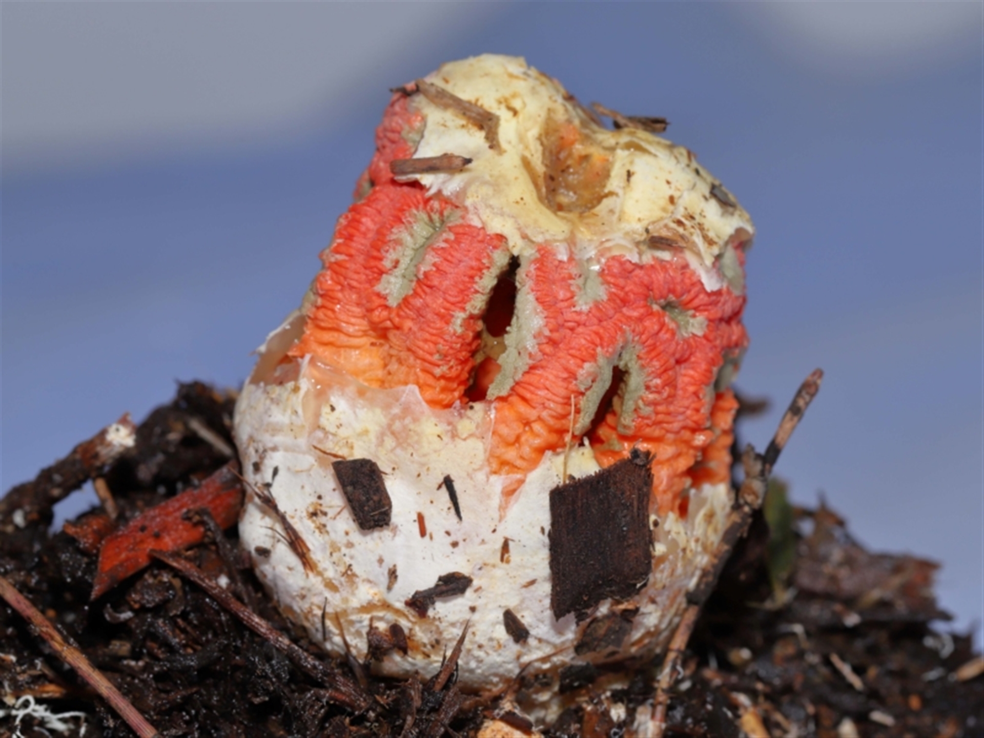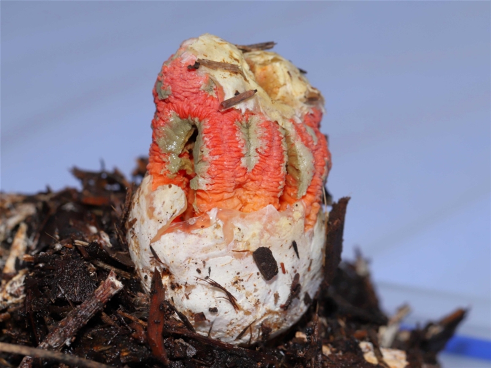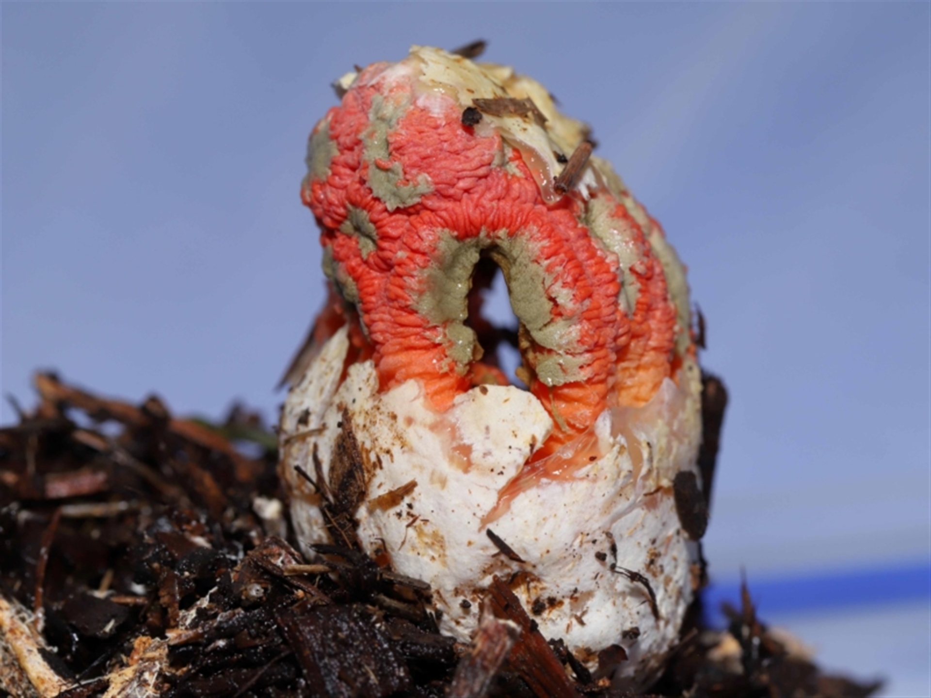 The sequence of images shows a Craypot Stinkhorn fungus in the process of emerging from its gelatinous egg. In these images the fungus was about half its fully emerged size. (The full-sized fungus is recorded in a separate NatureMapr sighting). The fungus egg was originally found at a location where several of these fungi had recently grown after rainstorms and very humid weather. Unfortunately, the fungus eggs typically appeared late afternoon and whilst growing during the night and early morning, were being completely eaten, presumably by flies, slugs, rodents and the like. To provide this photographic record of the fungus’ development, one egg was relocated to a protected location and allowed to grow in isolation overnight. (The GPS coordinates for this sighting have been adjusted to show the original location where the fungus egg was found). Close-up images of the developing fungus are shown in following sighting 4539258 to help with identification.