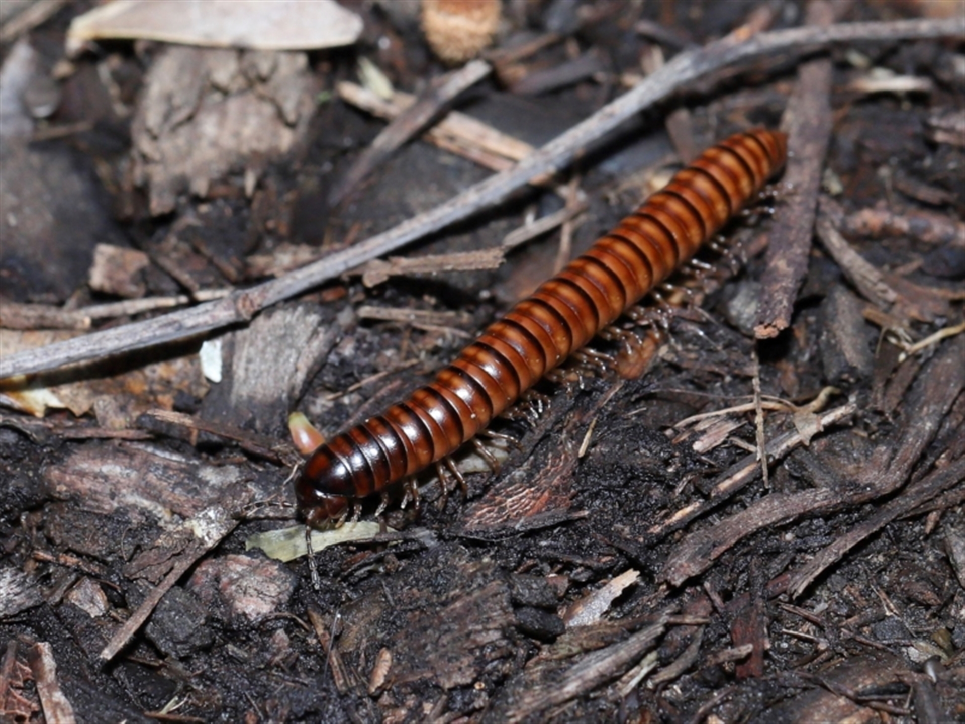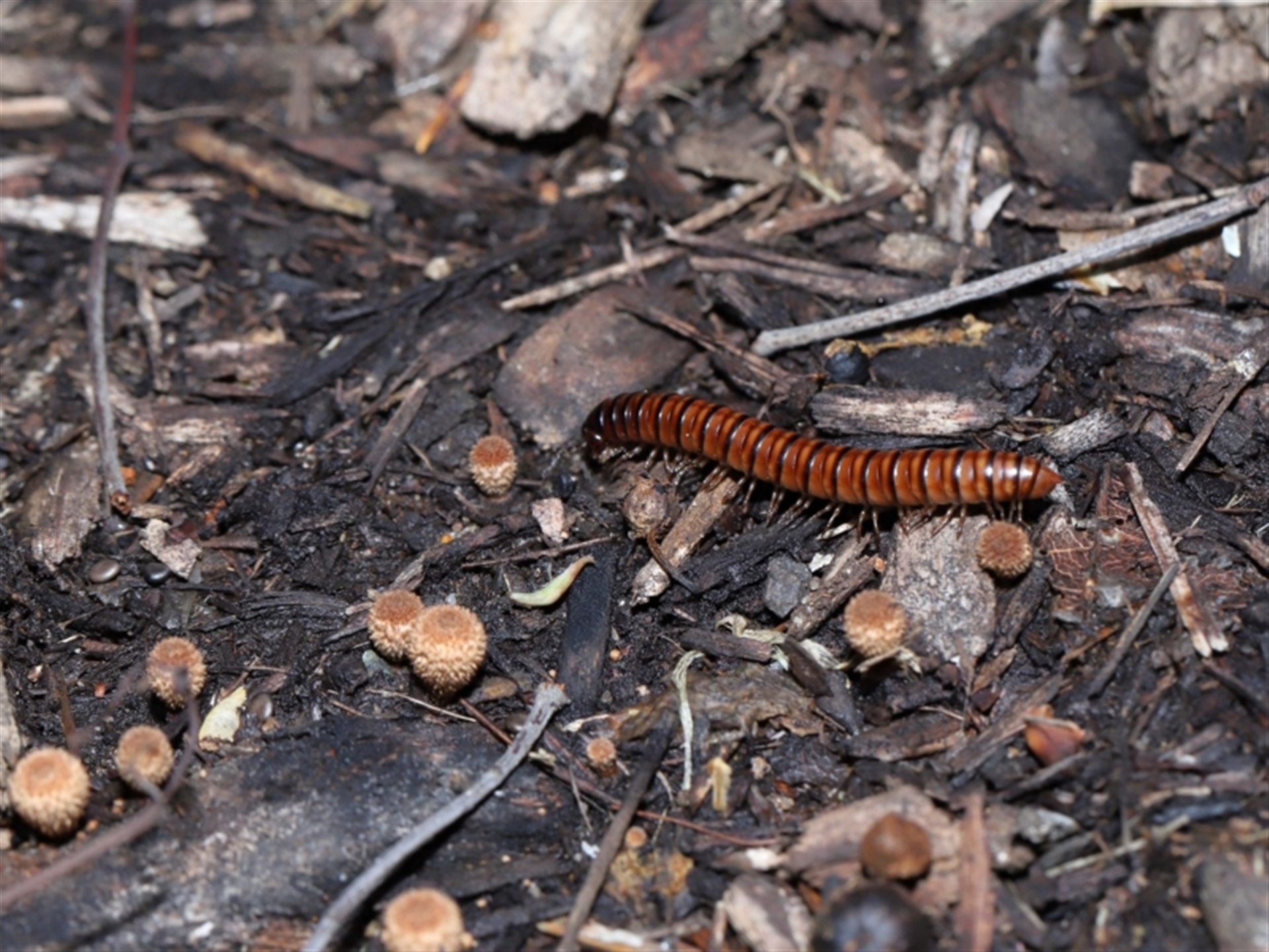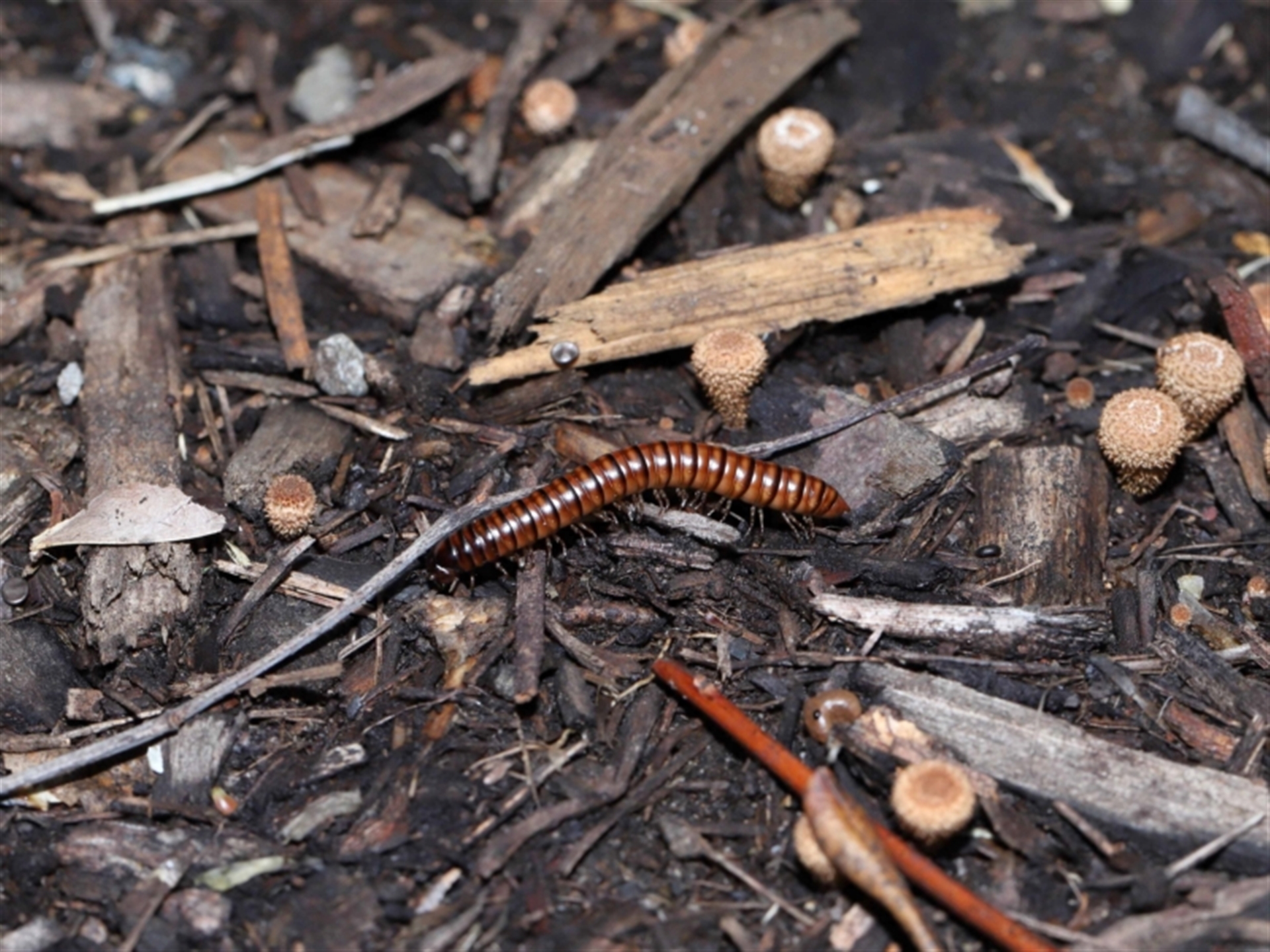 Thanks to Barbara for the initial sighting of the Millipede. It was working its way across wood chip mulch that was covered with Birds Nest fungi. The Millipede appears to be a female based on the leg configuration.