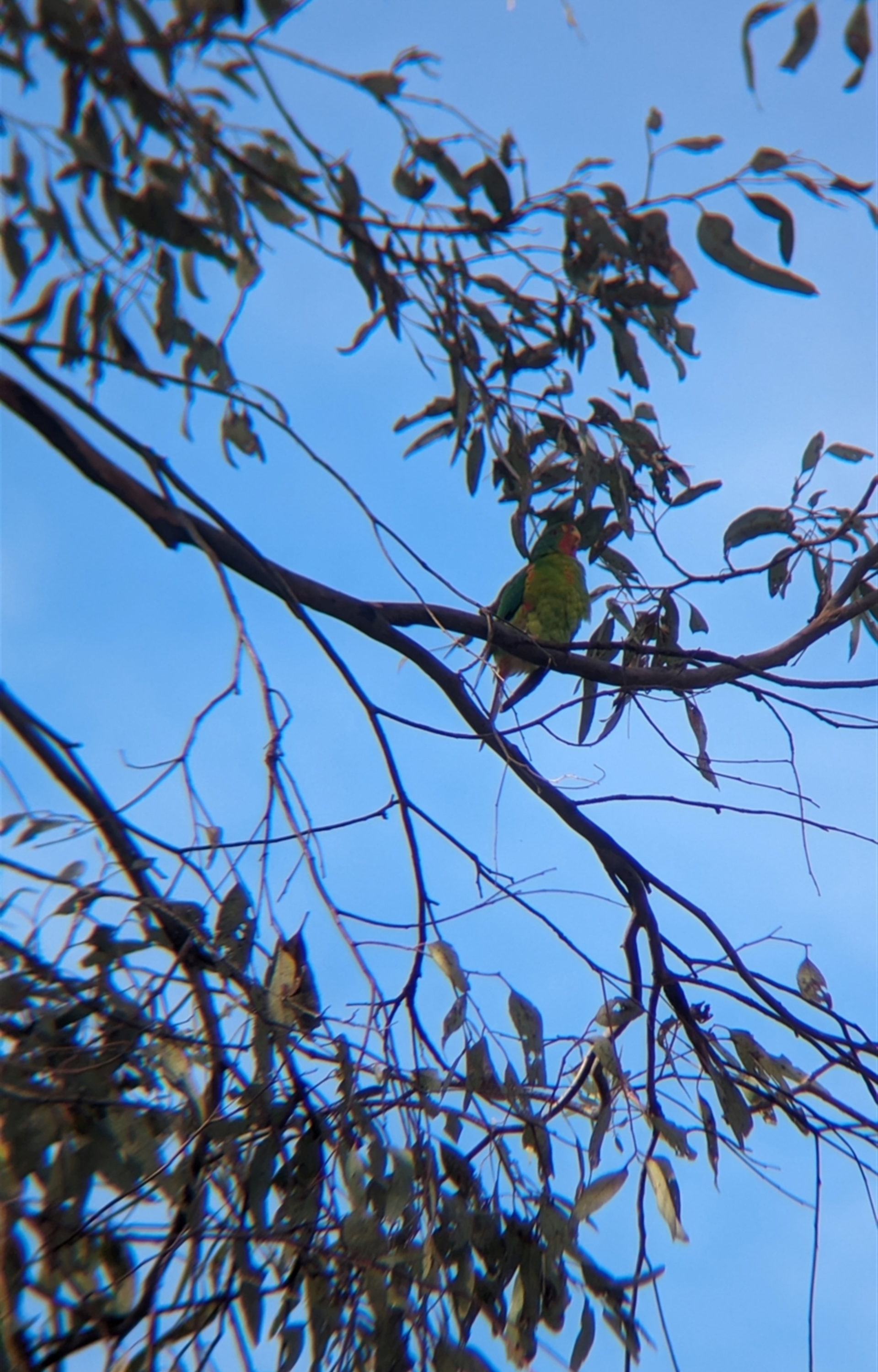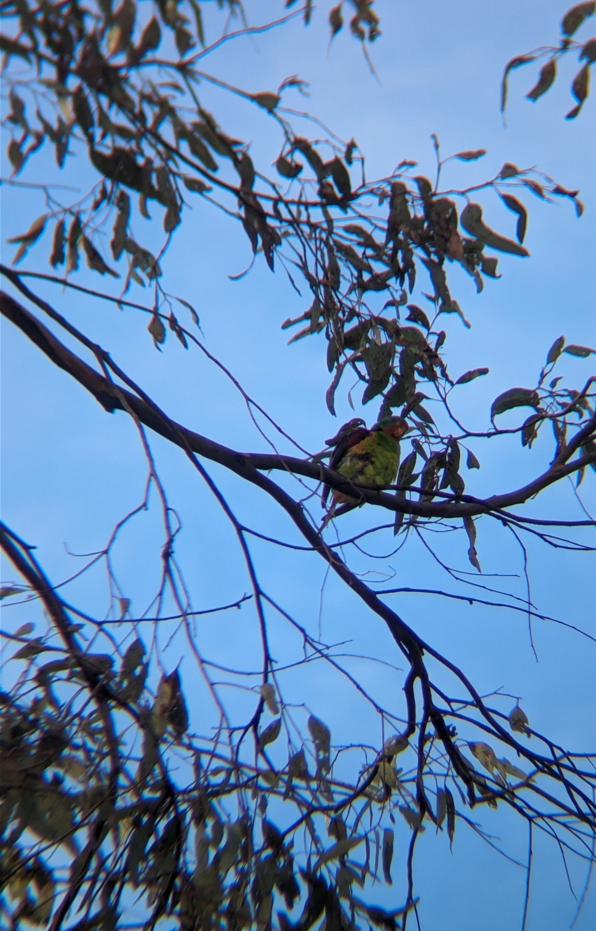Several swift parrots feeding on lerp in mugga ironbark, chirping occasionally very quietly. This individual gave us brilliant views of it preening for almost five minutes.