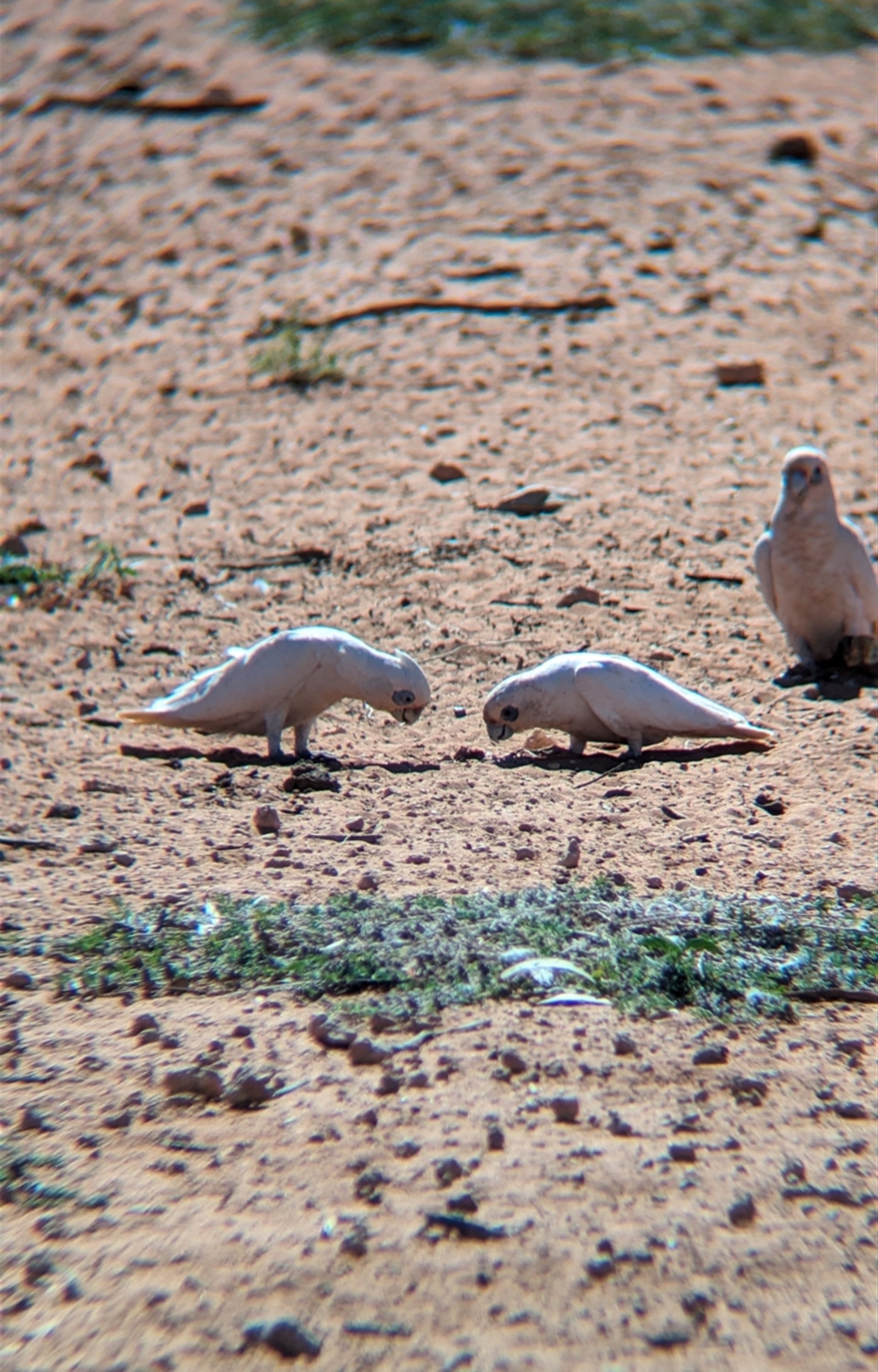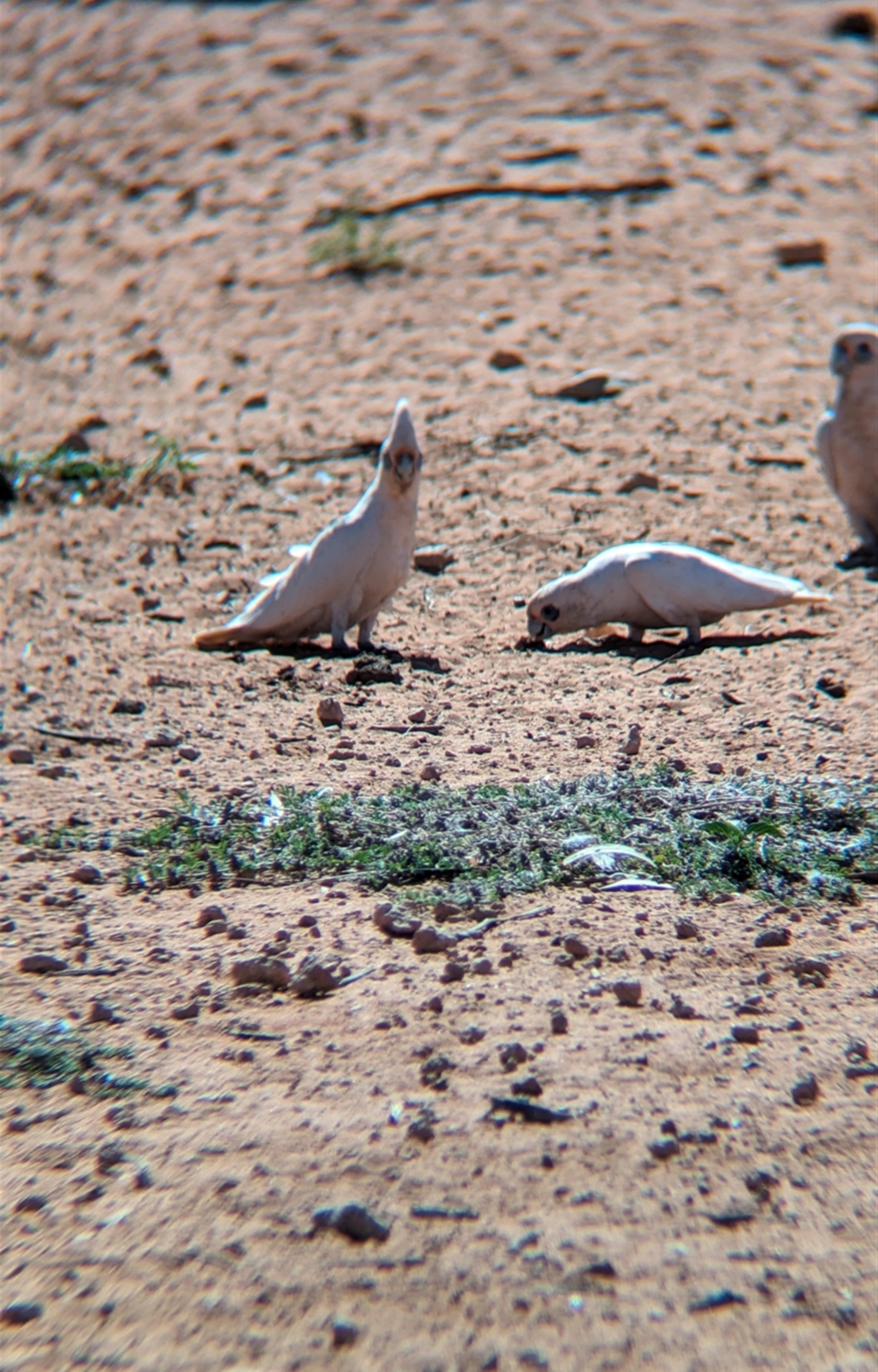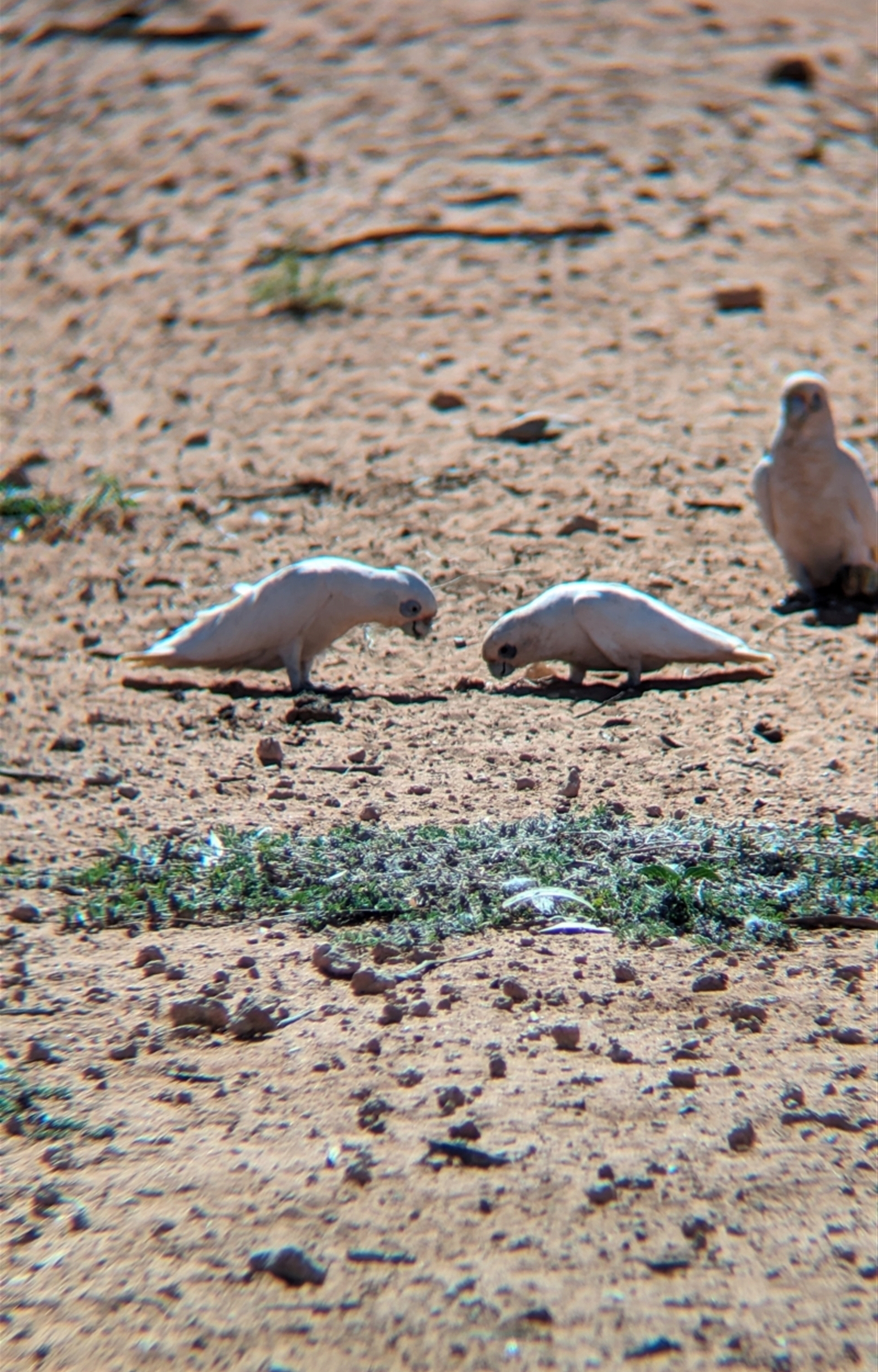 Flock of little corellas foraging around the roadhouse