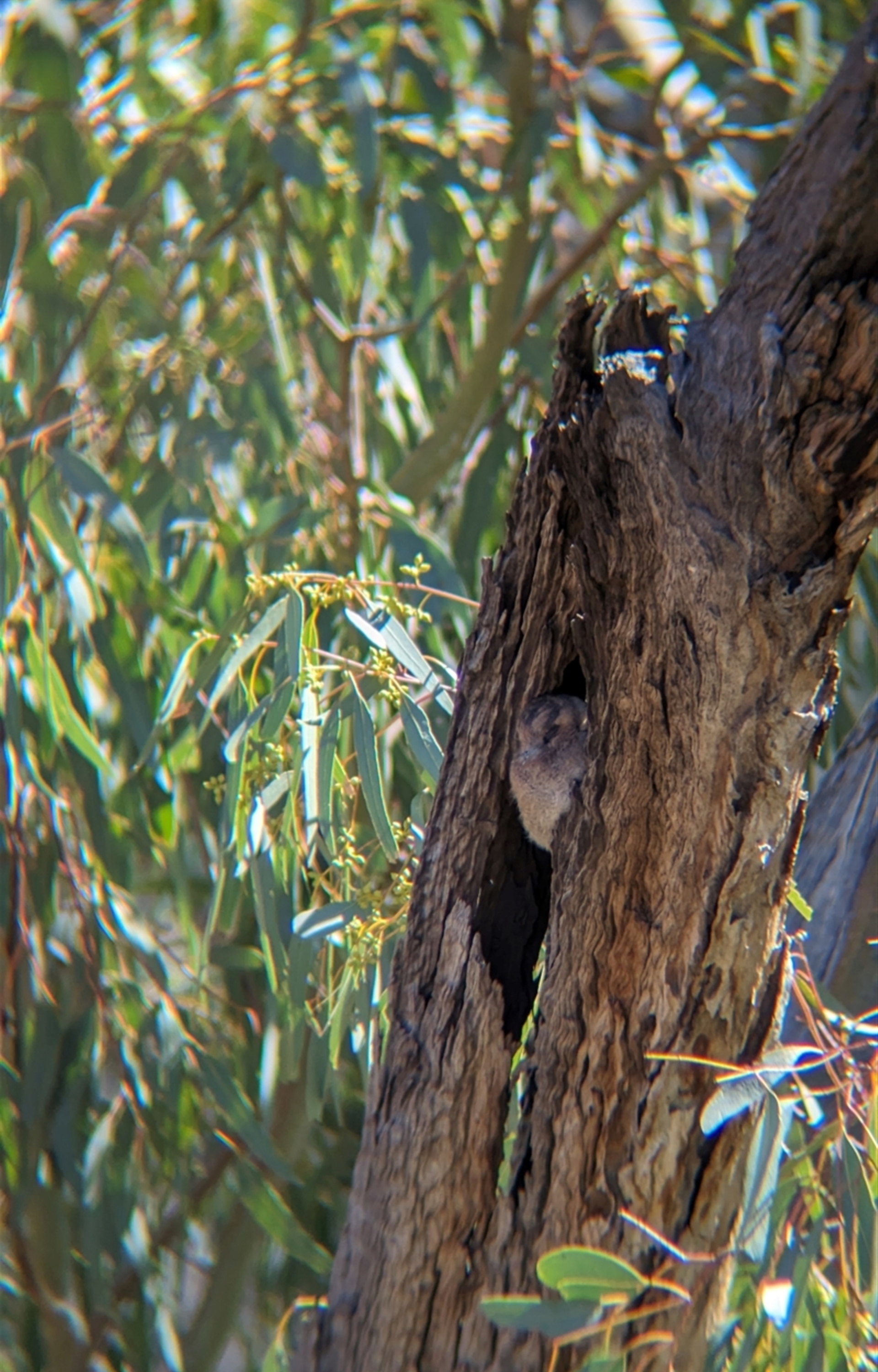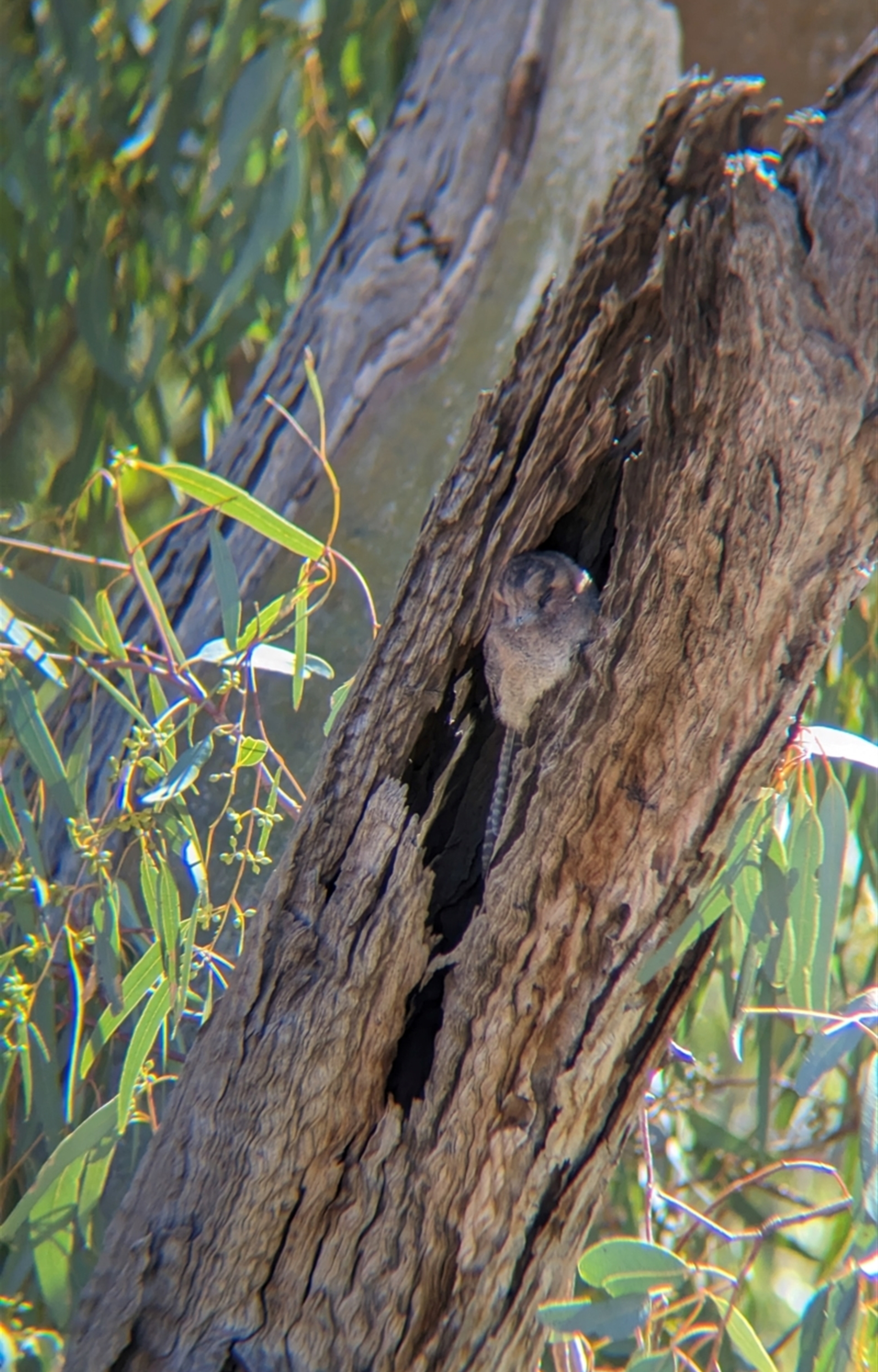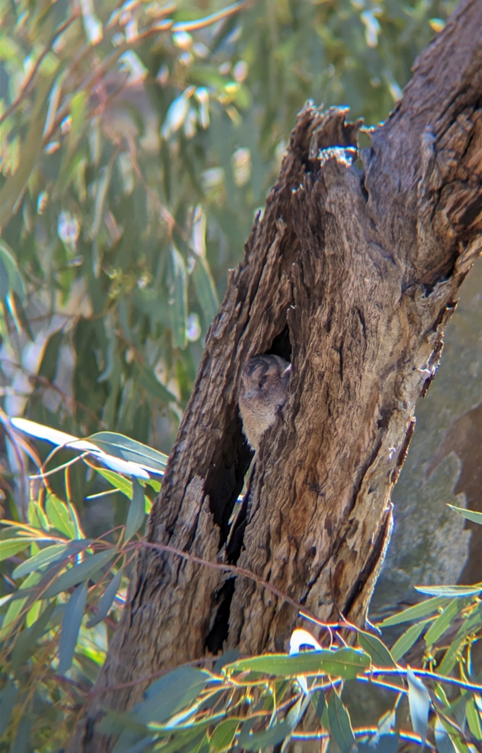 Single Australian Owlet-nightjar, snoozing in a tree hollow.