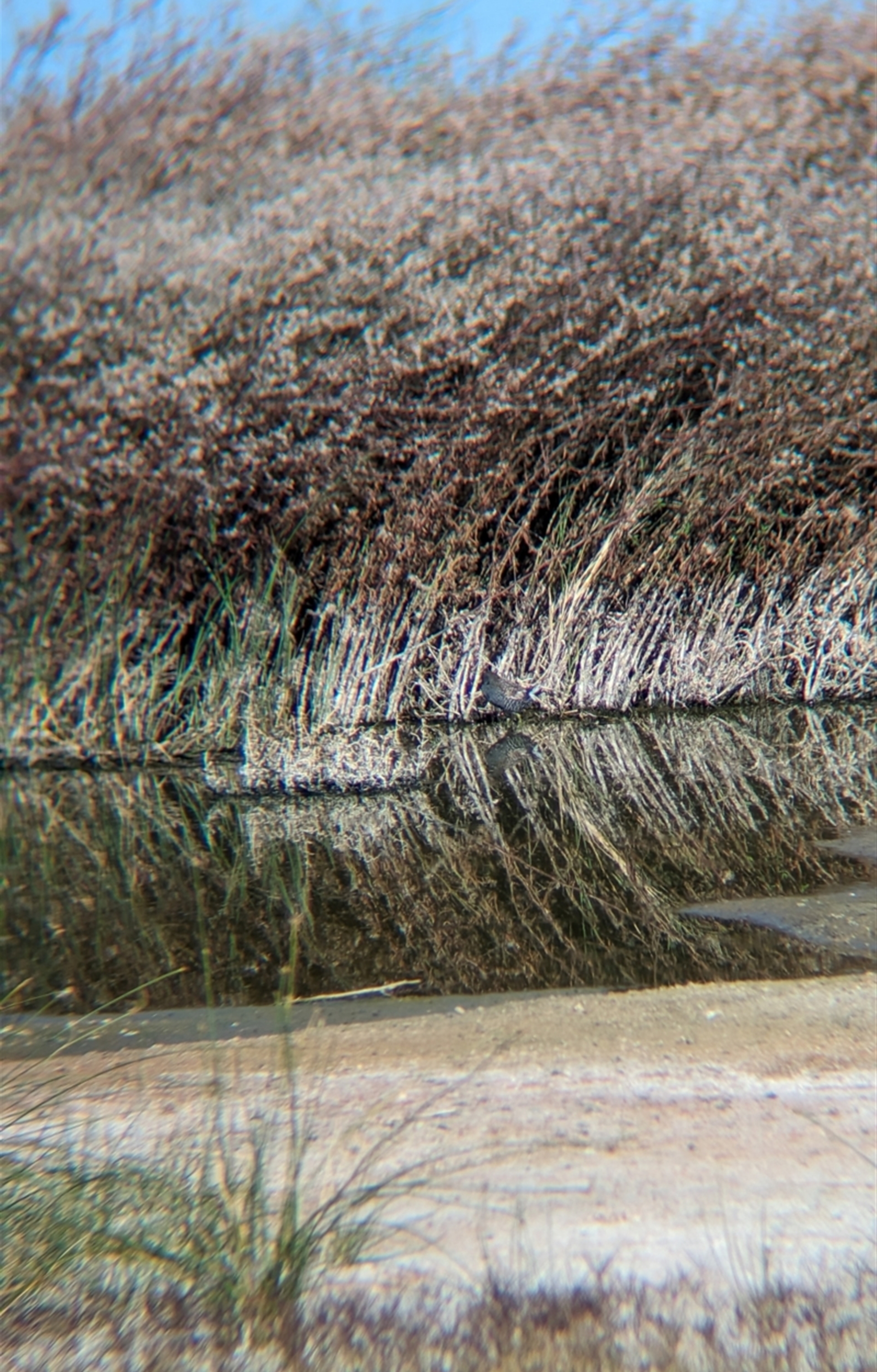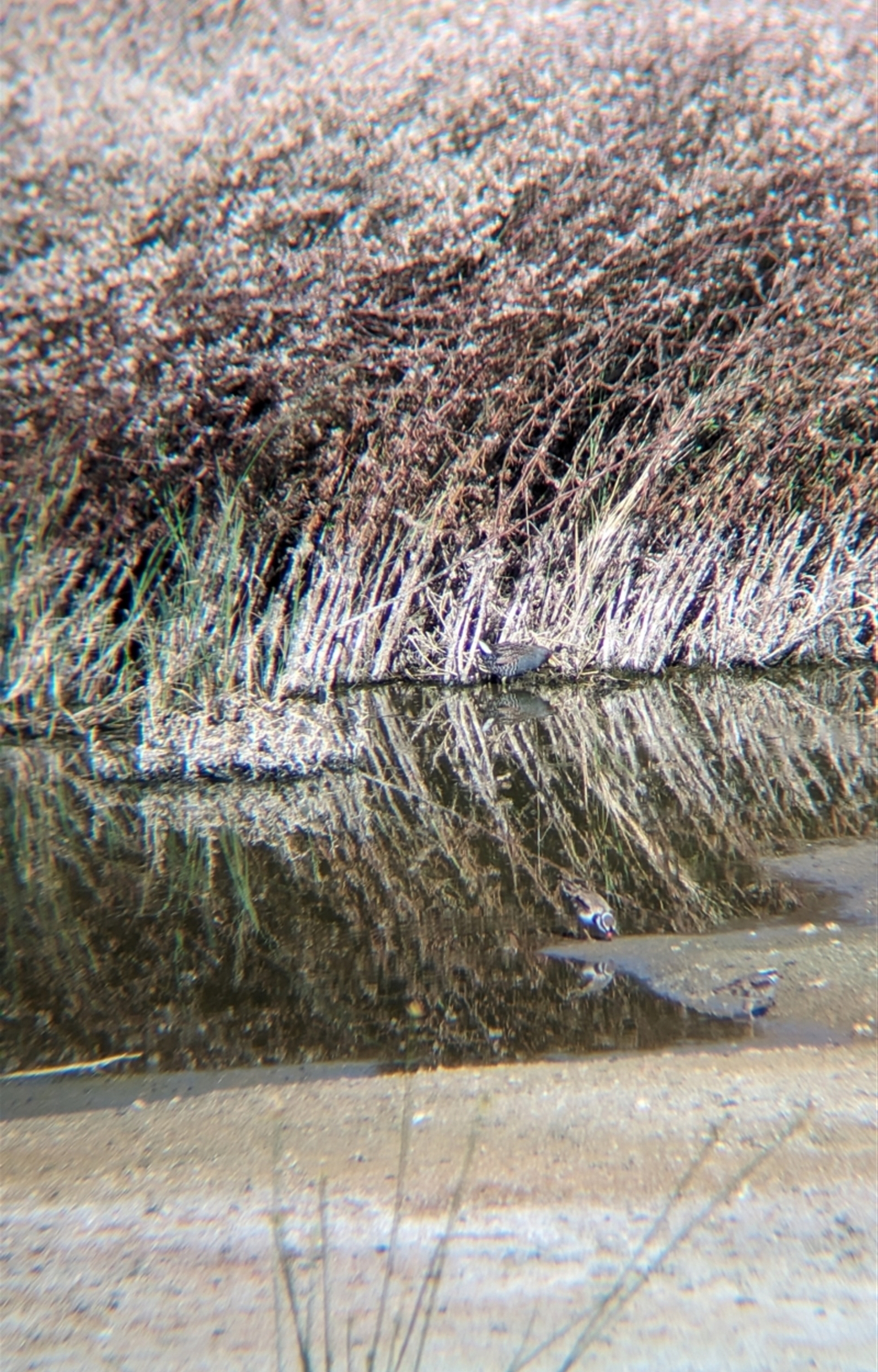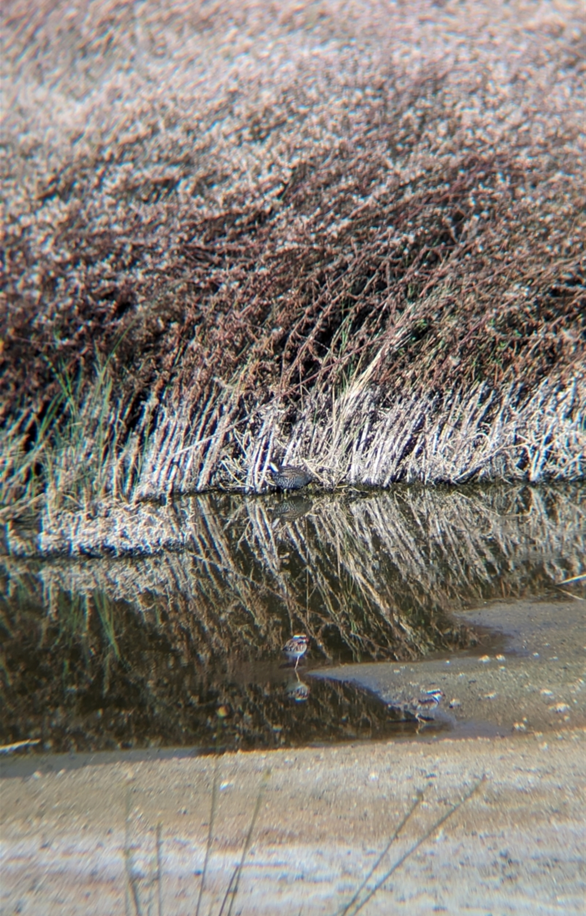 Pair of spotted crakes foraging along the edge of the ponds