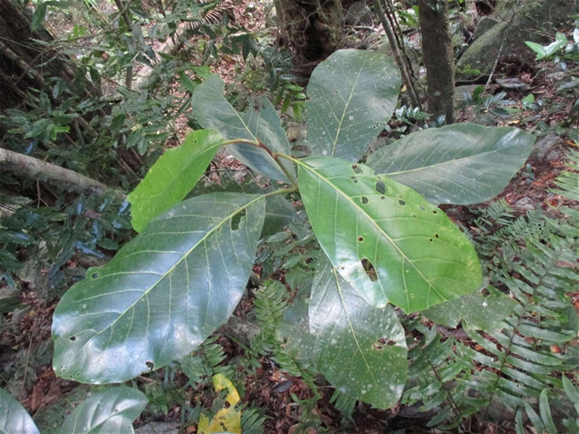 Sapling, not tall, showing the large leaves, saplings of this species have, with recent new growth; in the road side and river bank forest ground storey, shady and fairly protected position near but not on these edges –conditions. Mature trees have much smaller leaves for the canopy sunny, windy, exposed, conditions. Mossman Gorge, shuttle buses' entry road sides, road north side area, right near the river bank, after passing the second creek causeway then to near the national park large sign.